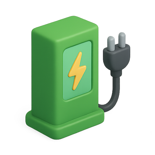 A stylized 3D icon representing an electric charging station, featuring a green body and a power plug, ideal for energy-related applications and technology themes.