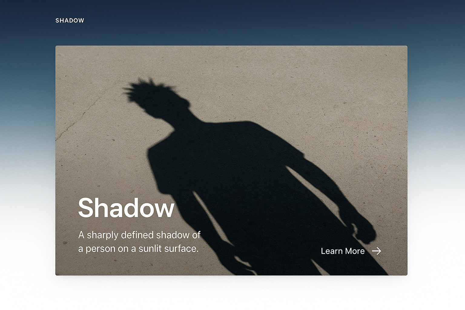 This image showcases a modern web design featuring a sharply defined shadow of a person on a sunlit surface, with clear text and a call-to-action button.