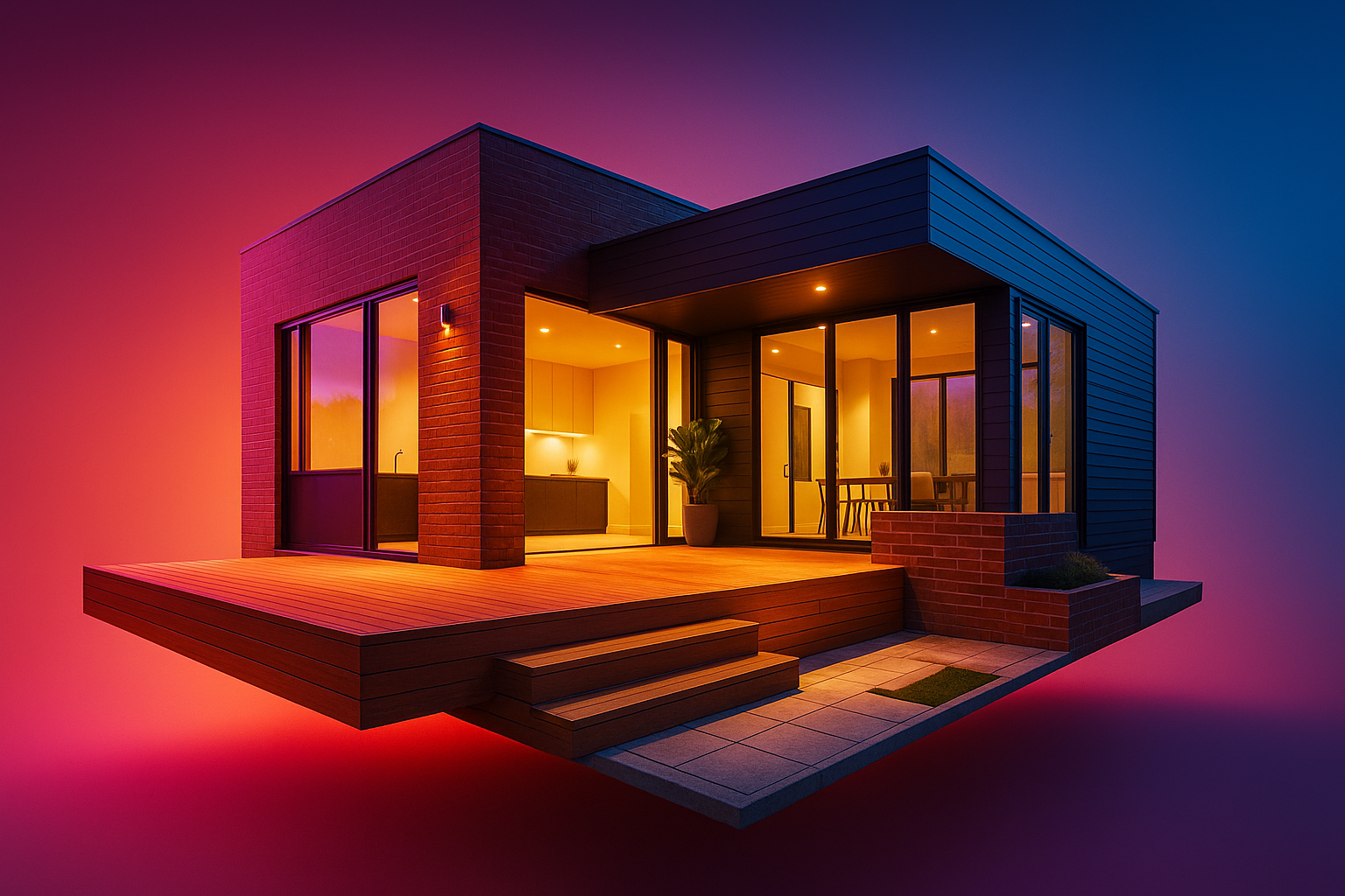 This image showcases a modern home extension in Melbourne, featuring a spacious deck, patio, and courtyard. The dynamic lighting creates a striking visual effect.