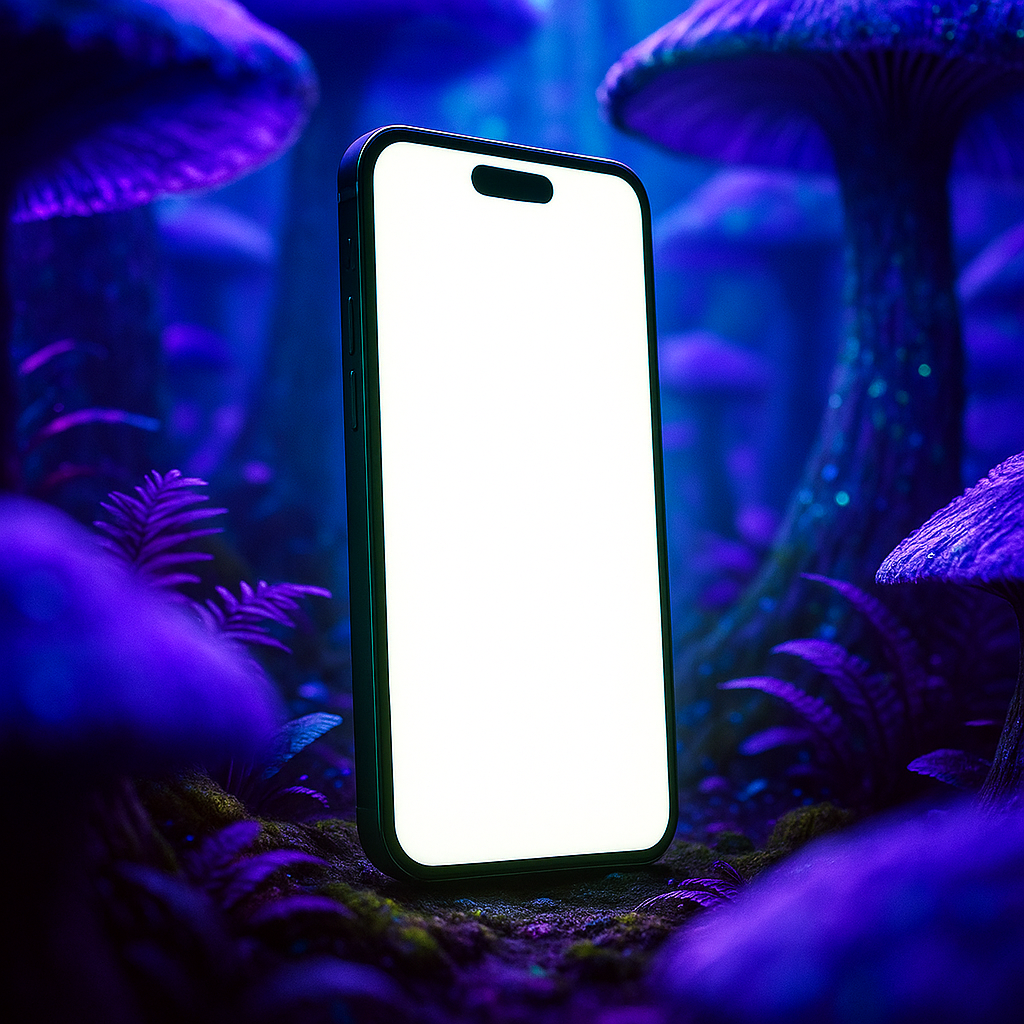 A smartphone is positioned in a mystical forest environment, surrounded by vibrant mushrooms and foliage, perfect for showcasing app designs or digital art.