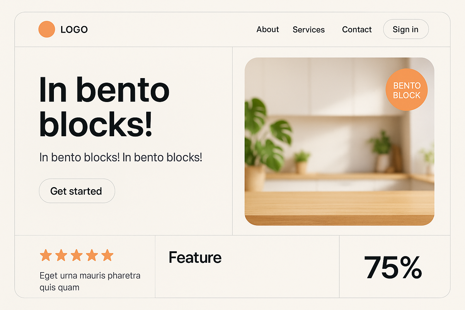 /Collection: /by davooda/Type: PNG/A clean, modern bento-style landing page design featuring bold typography, geometric blocks, and a well-lit kitchen background, emphasizing clarity and balance.
