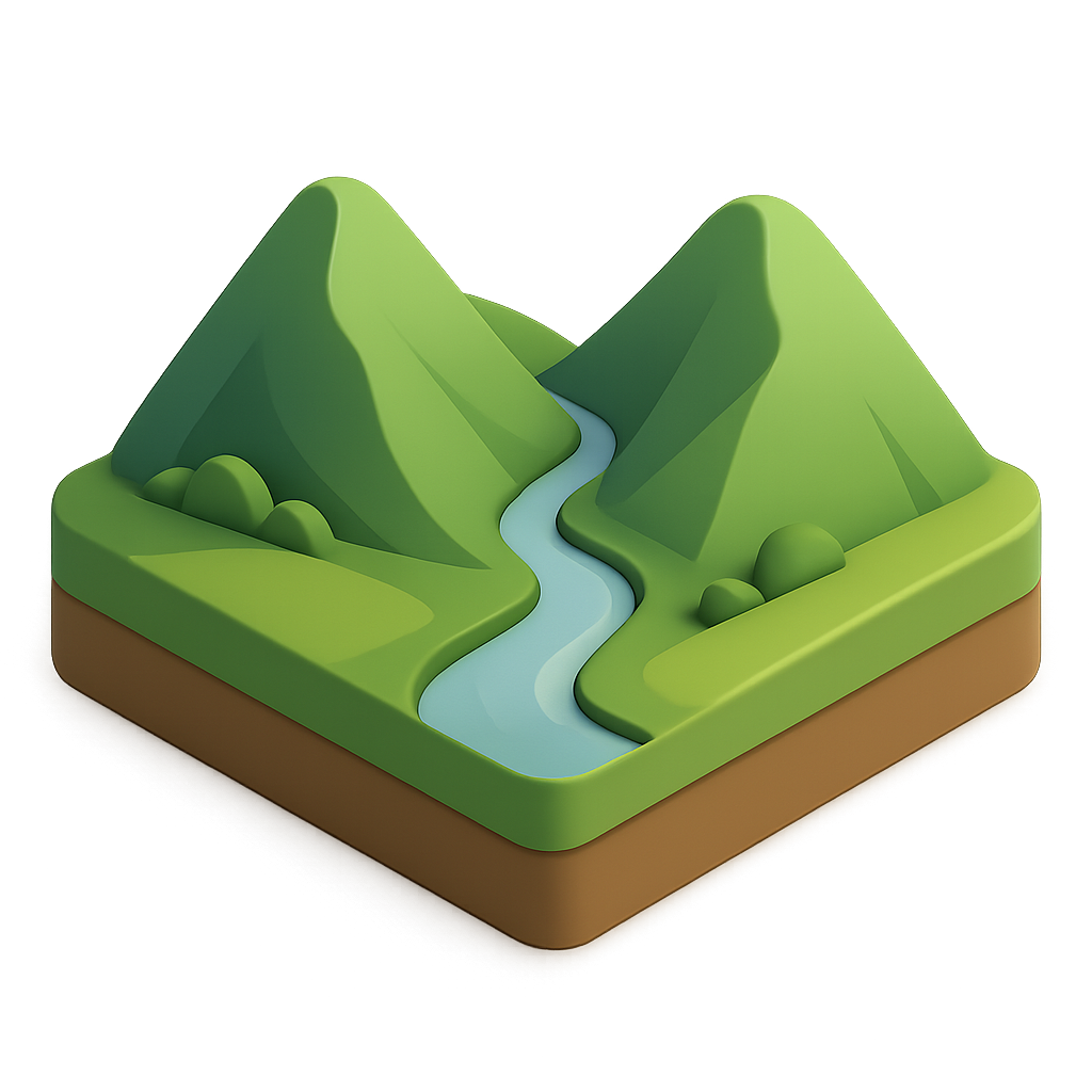 A vibrant 3D icon depicting a stylized valley with two green mountains flanking a winding river. The isometric view enhances the volumetric feel, set against a soft gradient background.