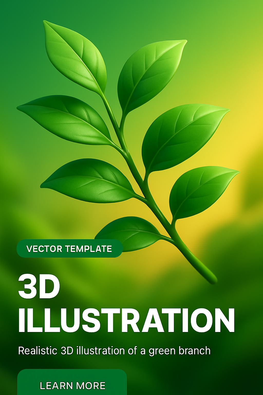/Collection: /by davooda/Type: PNG/This image features a realistic 3D illustration of a green branch, designed as a vector template. It is suitable for graphic design projects, nature themes, and digital art.