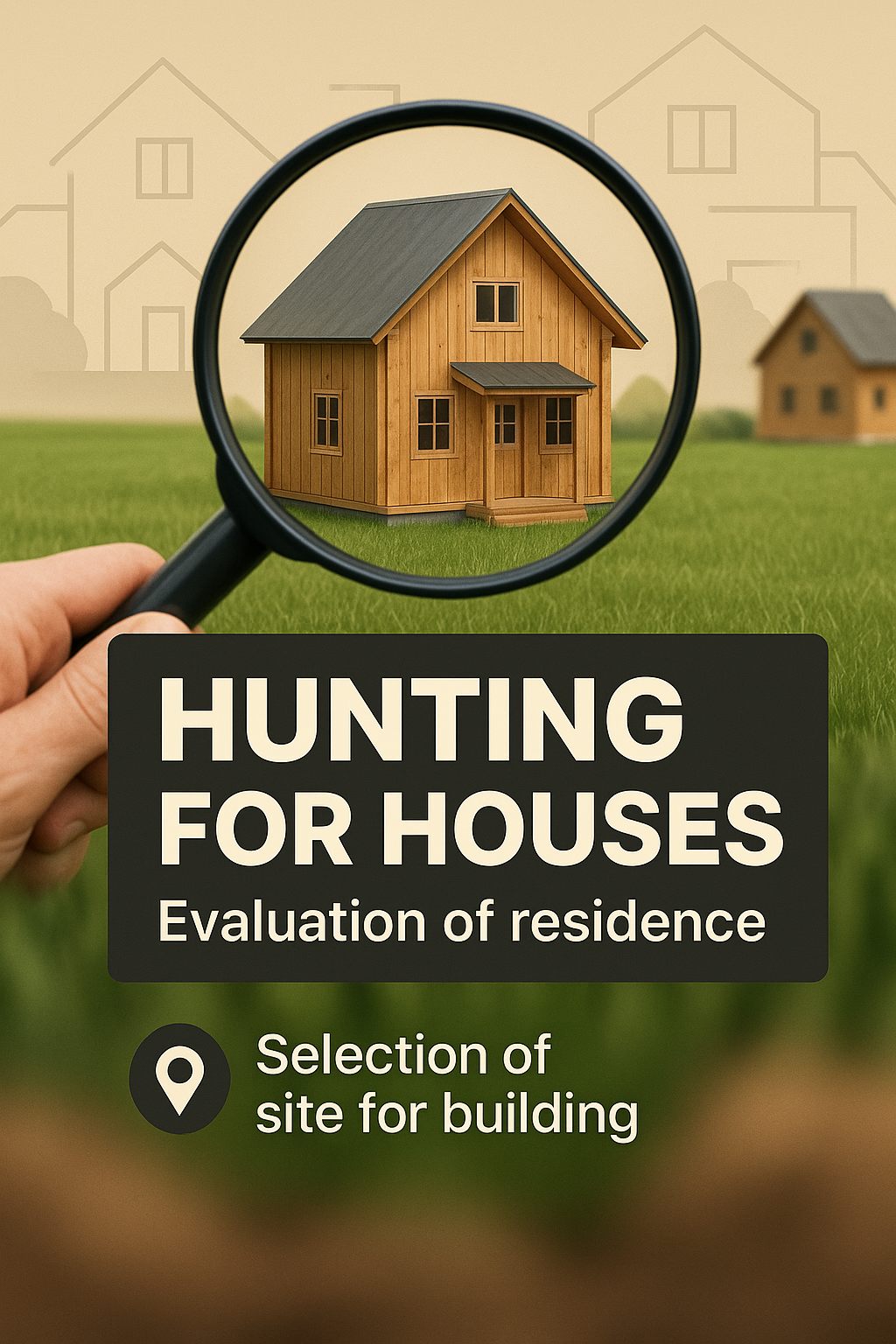 A visually engaging graphic depicting the concept of searching for houses, featuring a magnifying glass focusing on a wooden house. Ideal for real estate marketing and informational materials.