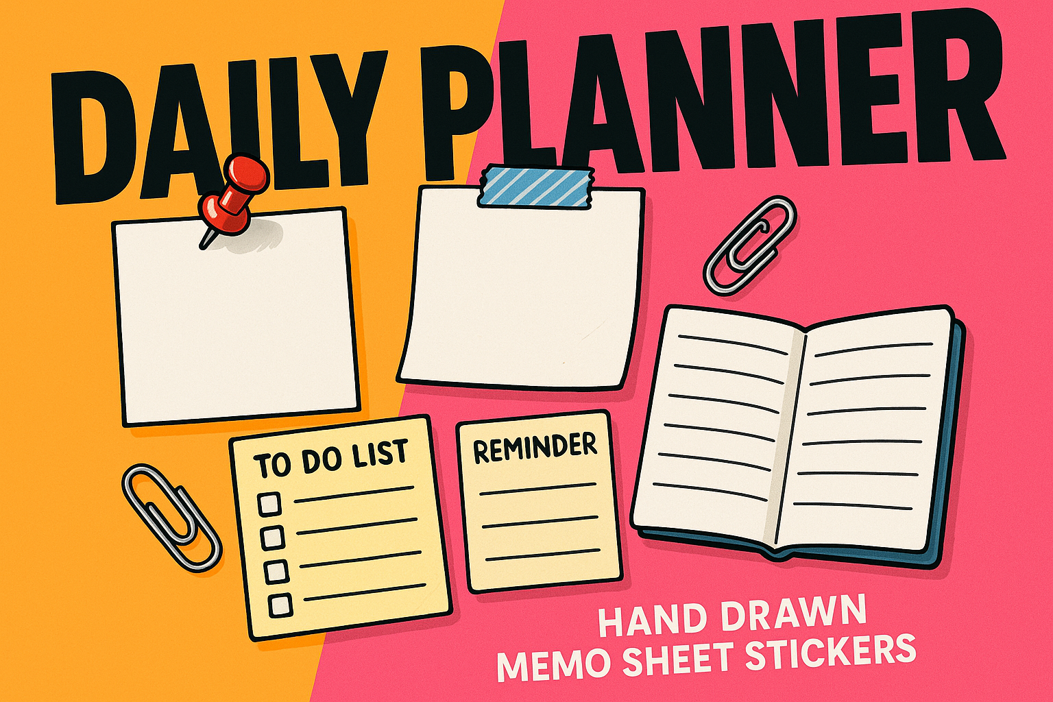 A colorful composition featuring hand-drawn memo sheet stickers, paper notes, and planner elements. The layout is bold and modern, with large text and vibrant backgrounds.