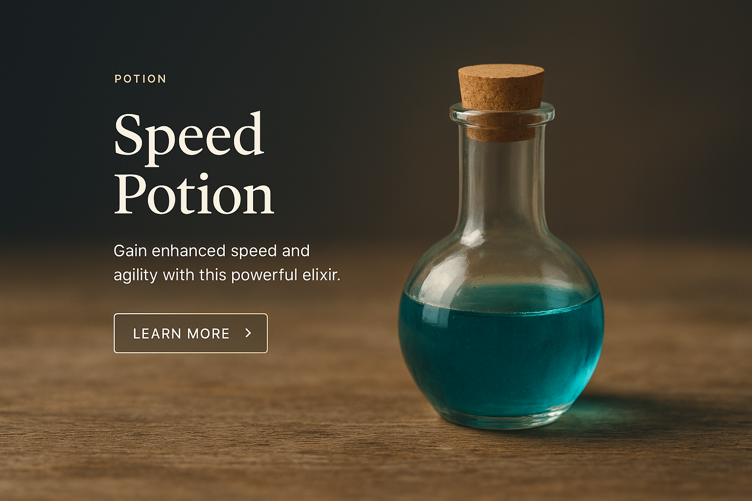 /Collection: /by davooda/Type: PNG/A beautifully styled speed potion in a glass bottle with a cork stopper. The blue liquid inside suggests agility and energy, complemented by a clean, modern layout featuring text and a call-to-action button.