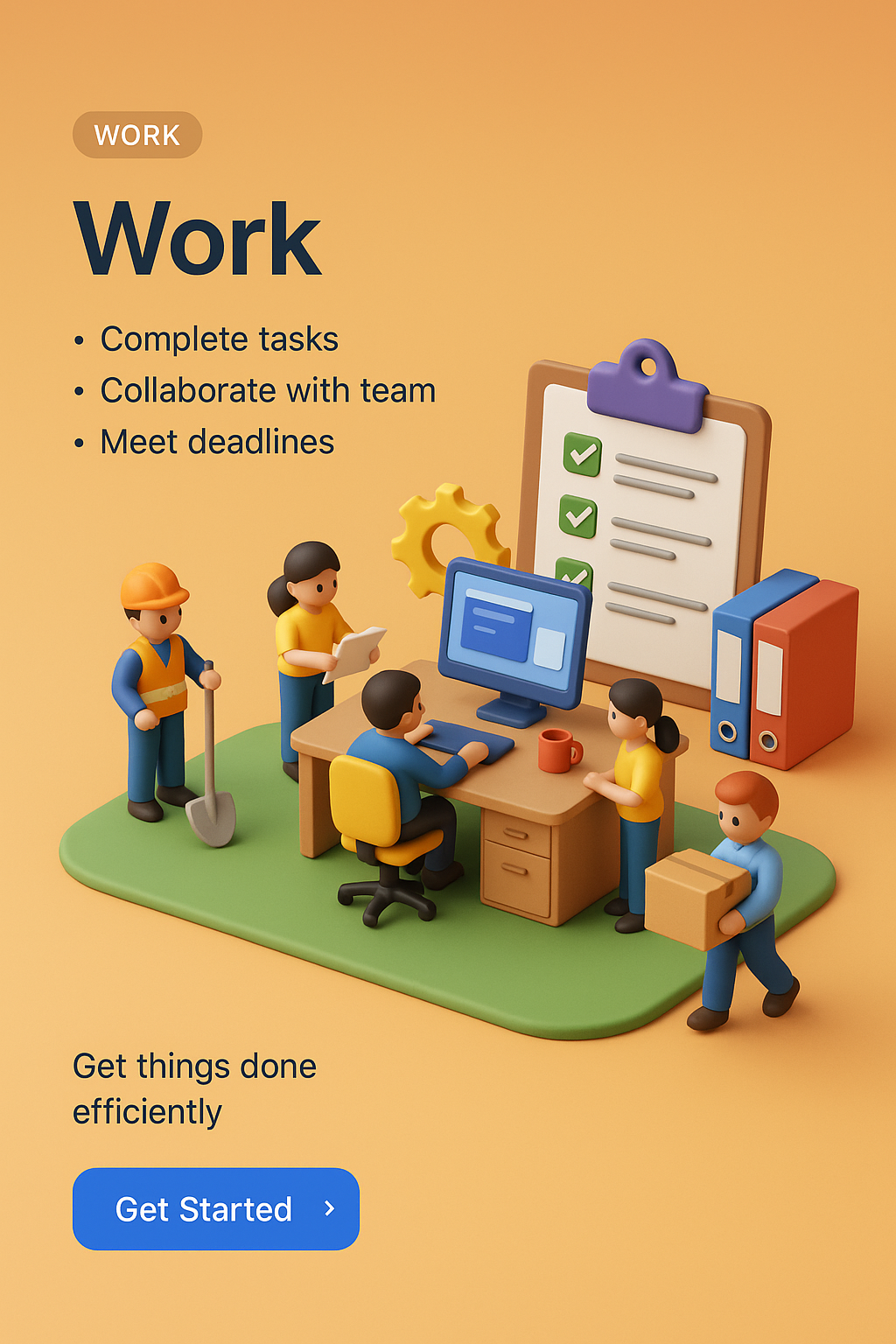 /Collection: /by davooda/Type: PNG/A vibrant 3D scene depicting small characters engaged in various work tasks around a desk. The background features a smooth gradient, enhancing the overall composition.