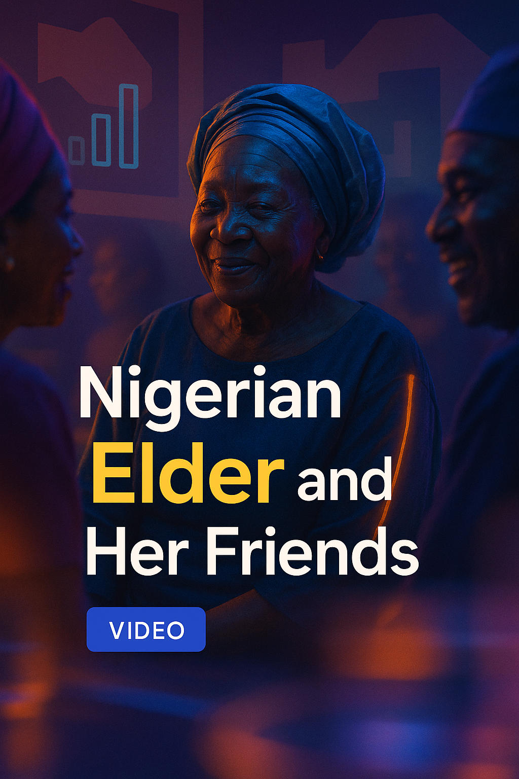 /Collection: /by davooda/Type: PNG/Engaging video thumbnail showcasing a Nigerian elder interacting with friends, featuring warm colors and a friendly atmosphere. Ideal for cultural content and community storytelling.
