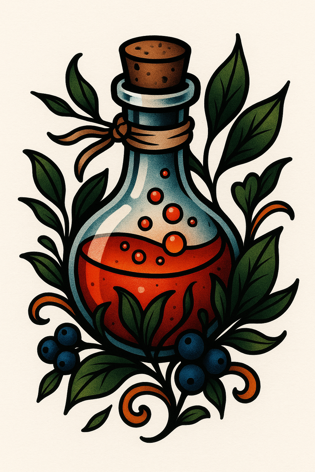 Artistic Illustration of a Potion Bottle with Botanical Elements