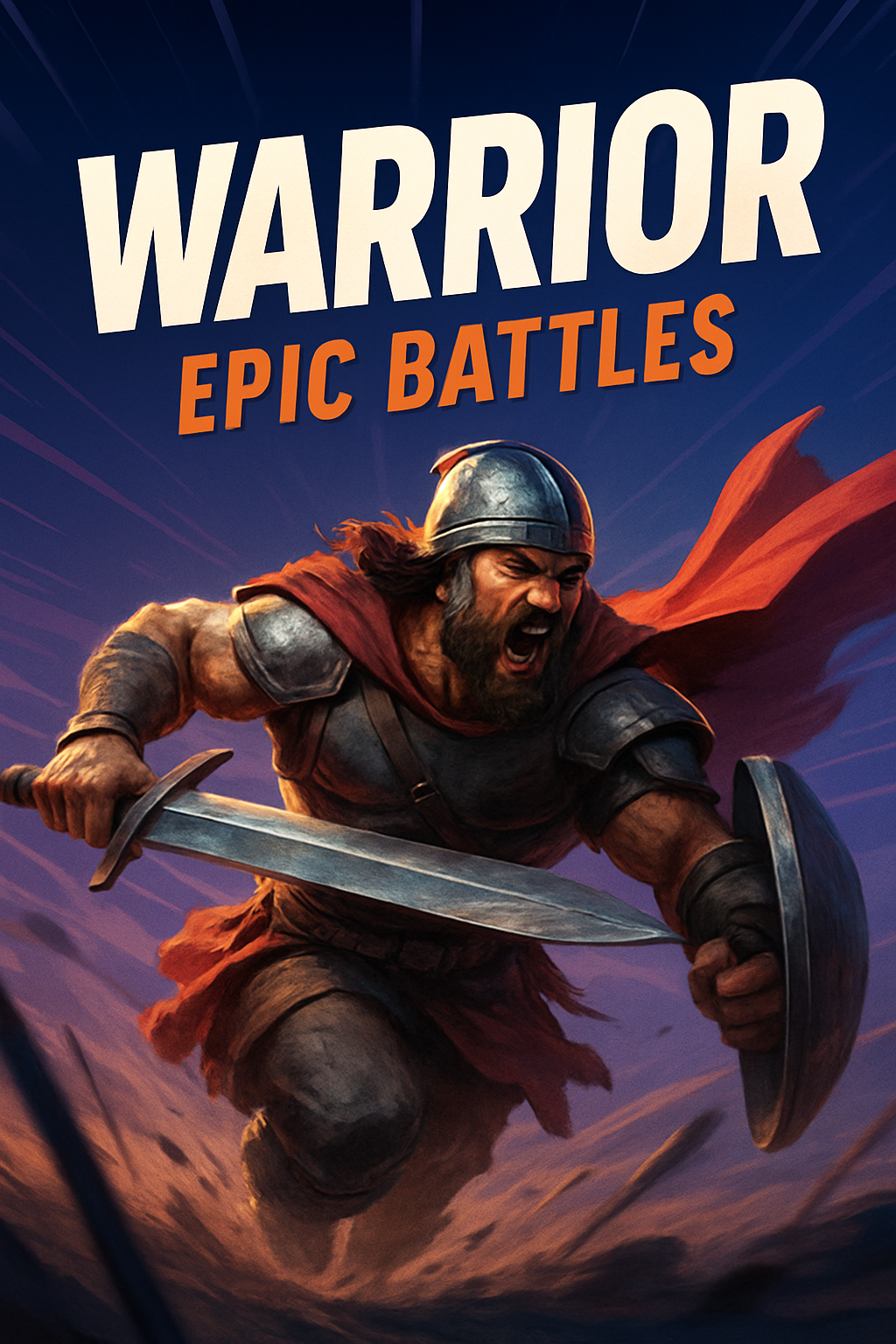 A fierce warrior charges forward with swords drawn, embodying strength and action. The dramatic background enhances the dynamic feel of the scene, with bold colors and engaging typography.
