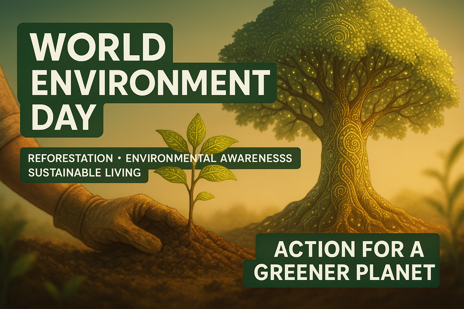 /Collection: /by davooda/Type: PNG/Illustrative graphic promoting World Environment Day, featuring a hand planting a seedling and a stylized tree, emphasizing themes of reforestation and sustainability.