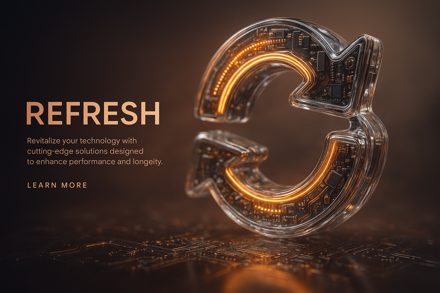/Collection: /by davooda/Type: PNG/A hyperrealistic 3D scene featuring a glass-like polymer sculpture shaped as a refresh symbol. It reveals glowing micro-LEDs and intricate circuit boards, set against a softly lit gradient background.