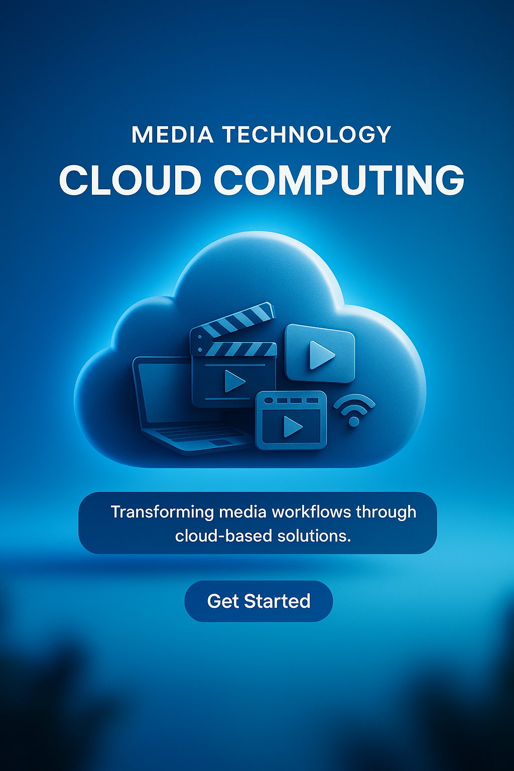 This is a promotional graphic for cloud computing in media technology featuring a stylized cloud with multimedia icons. It is designed for digital marketing use.
