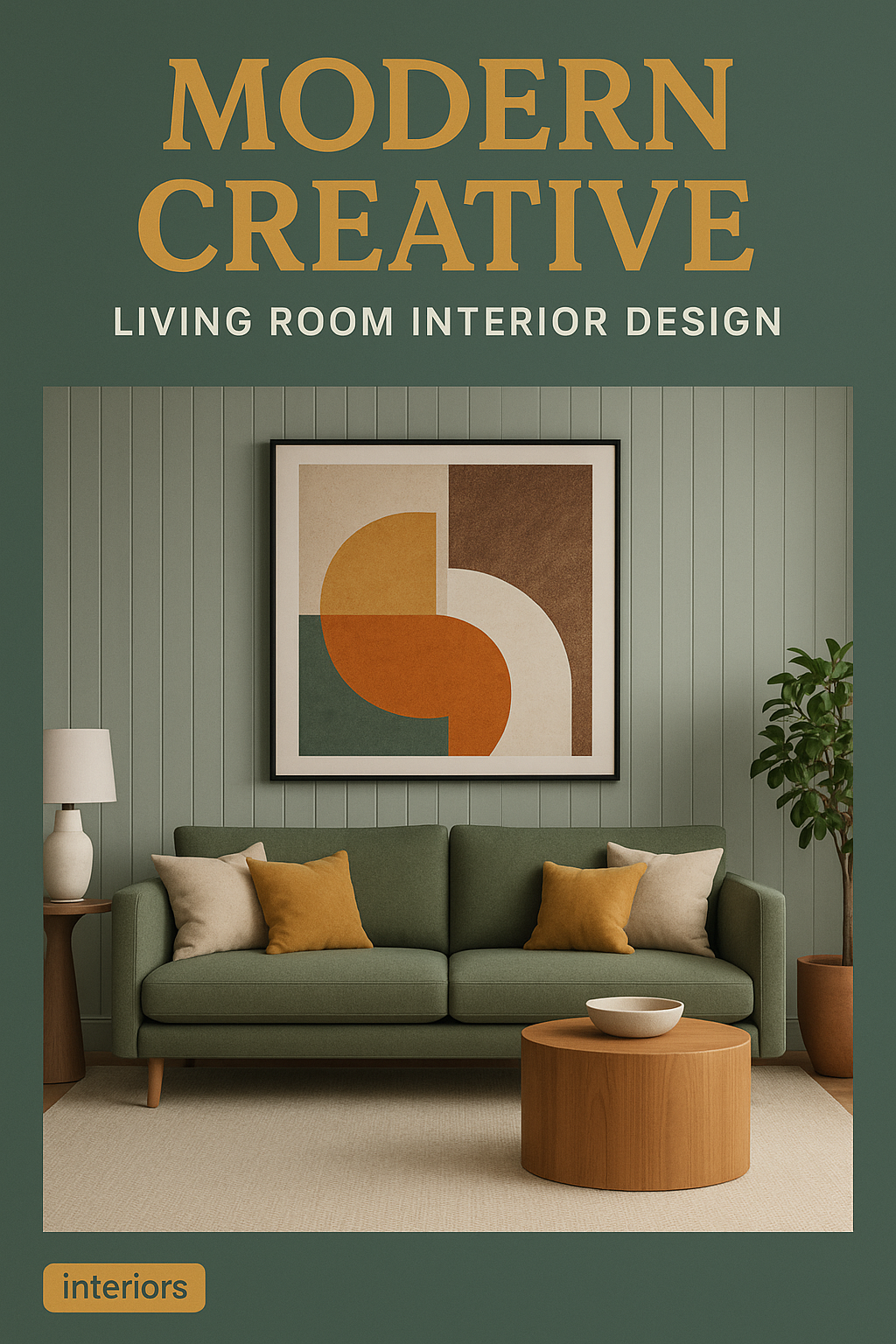 Stylish interior design image featuring a modern living room with a green sofa, abstract wall art, and minimal decor, ideal for home decor inspiration.