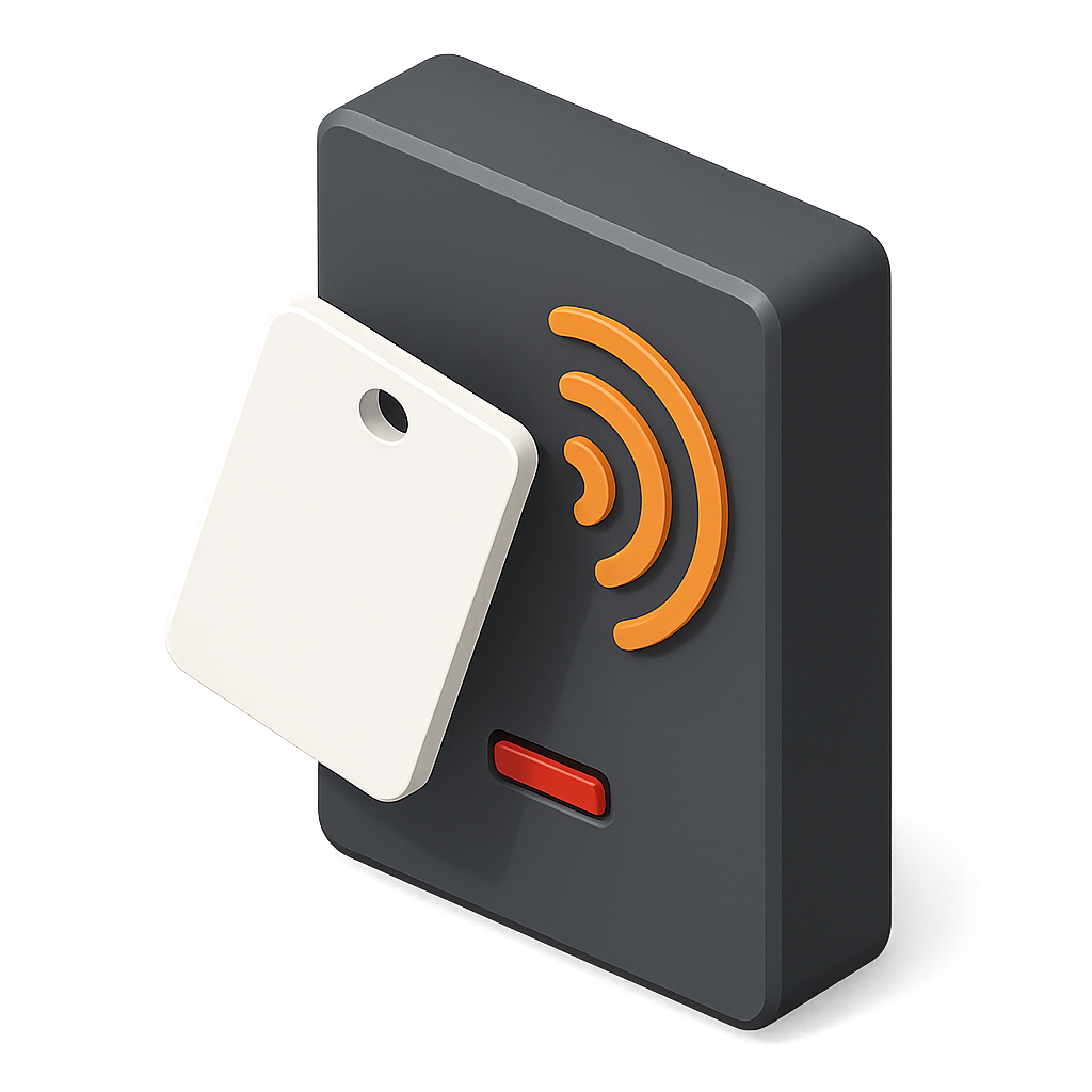 A 3D icon of an access card reader displaying a white card with a cutout, emitting signal waves in orange. The design features a sleek, modern look with a gray background.