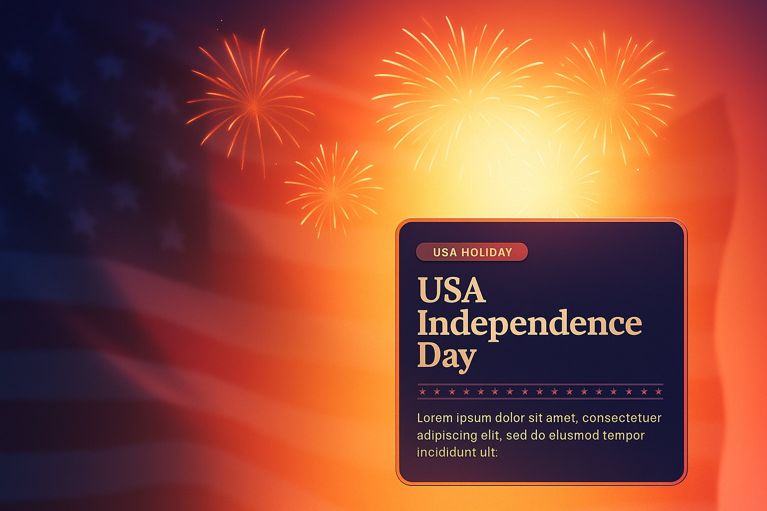 /Collection: /by davooda/Type: PNG/A vibrant display of fireworks illuminates the background of the American flag, celebrating USA Independence Day. The scene includes a stylish information block with a title and decorative elements.