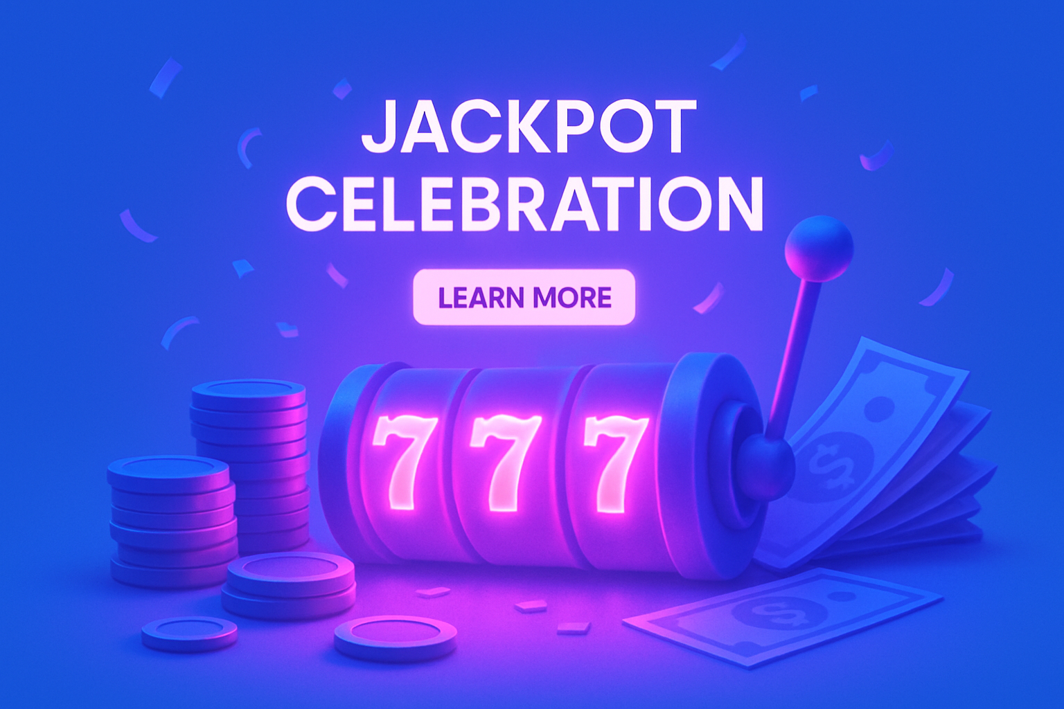 /Collection: /by davooda/Type: PNG/A vibrant scene depicting a jackpot celebration with neon-pink glowing slot machine reels, surrounded by coins and cash. The background features a solid blue color, enhancing the festive atmosphere.
