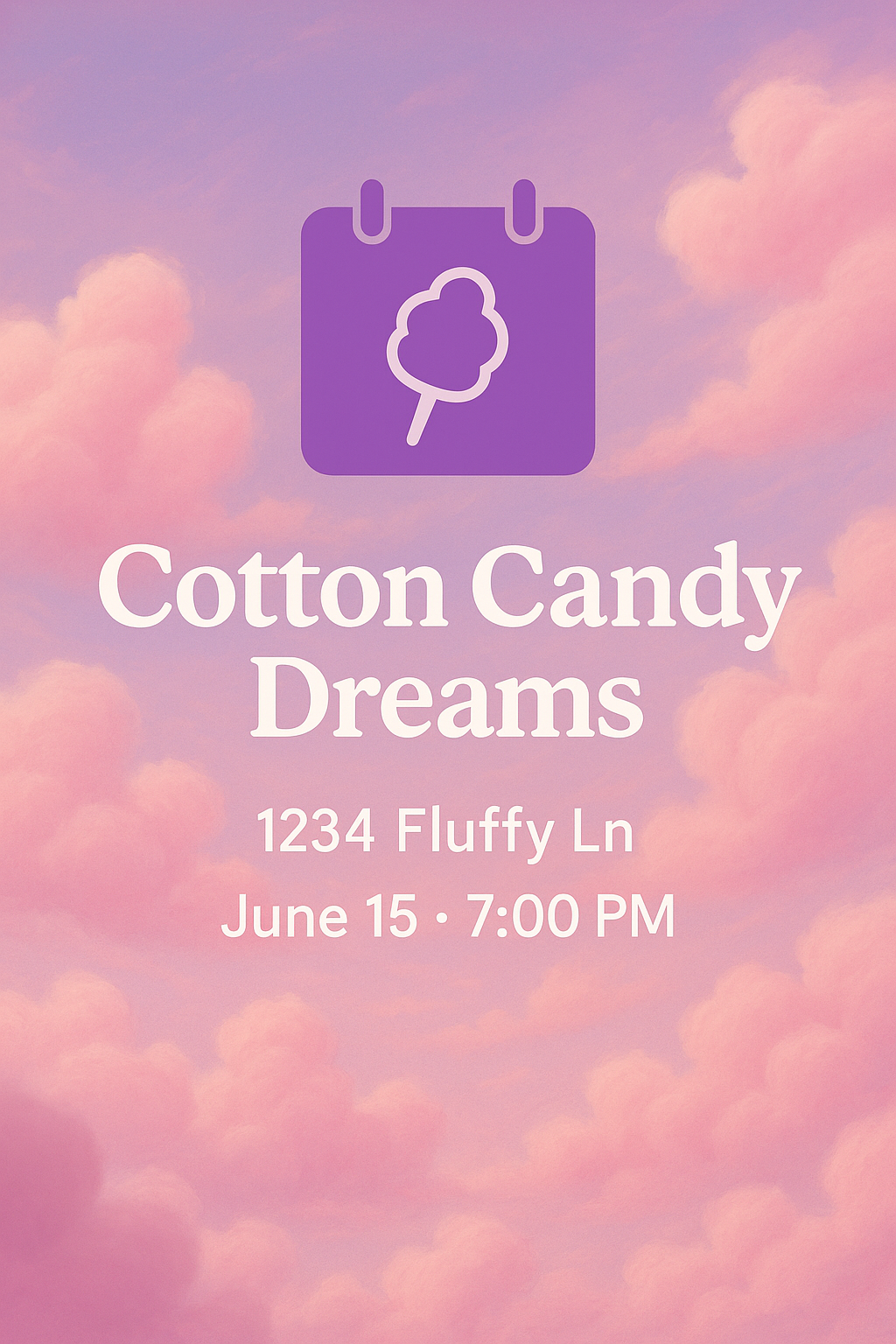 Charming event announcement graphic featuring pastel colors and soft cloud imagery, ideal for promoting a whimsical gathering or celebration.