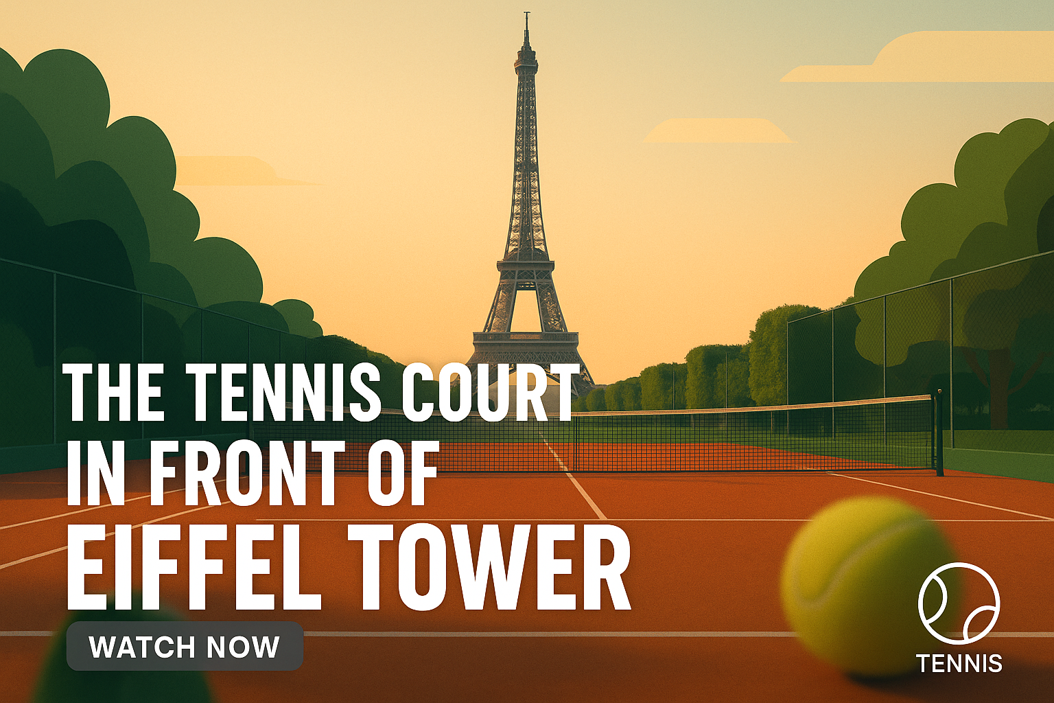 A whimsical digital illustration of a tennis court set against the backdrop of the Eiffel Tower, designed for promotional or advertising purposes in sports and recreational contexts.