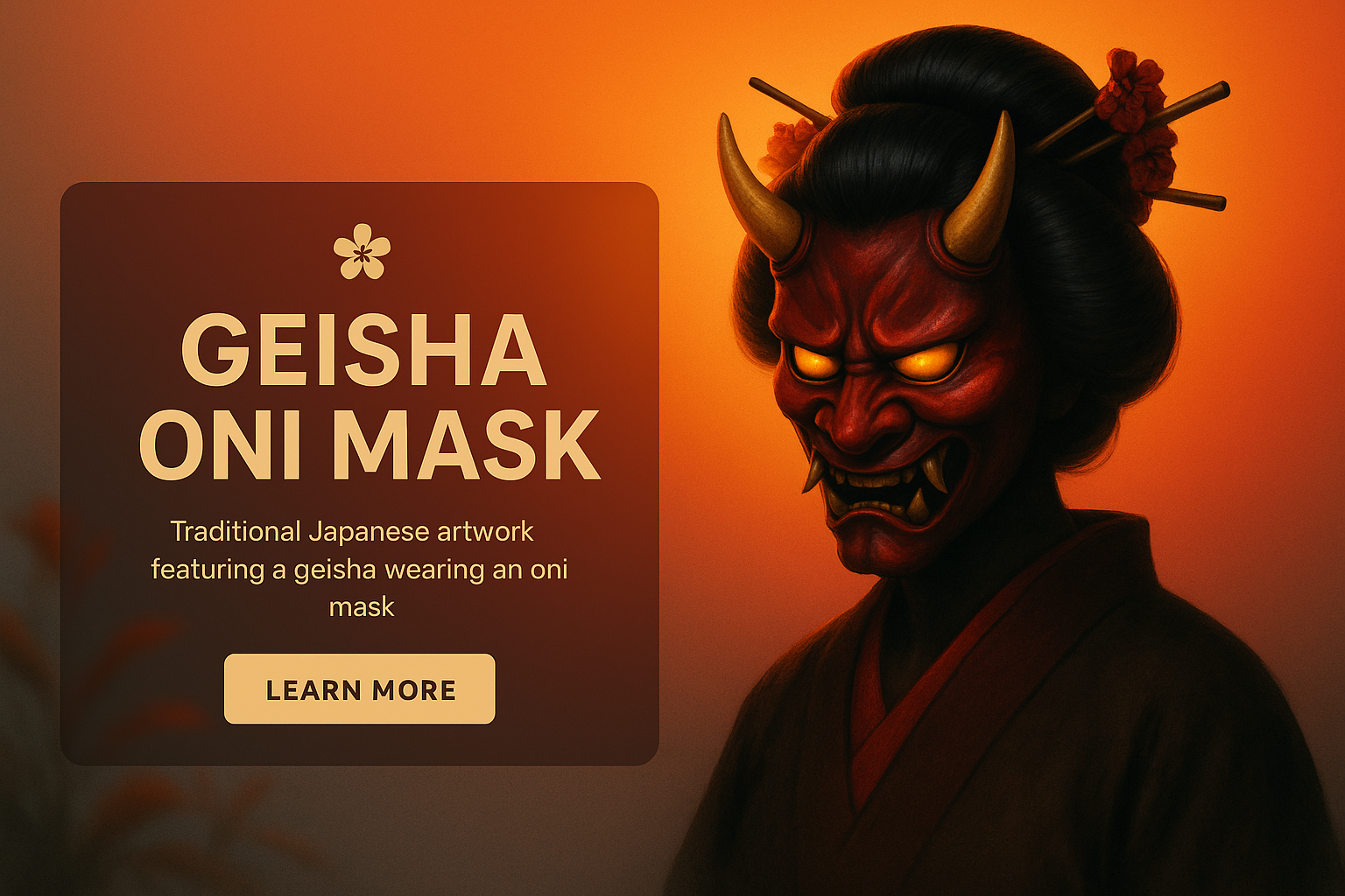 /Collection: /by davooda/Type: PNG/This image features a dramatic illustration of a geisha adorned with an oni mask, set against a warm, gradient background. It is ideal for cultural or artistic promotions.