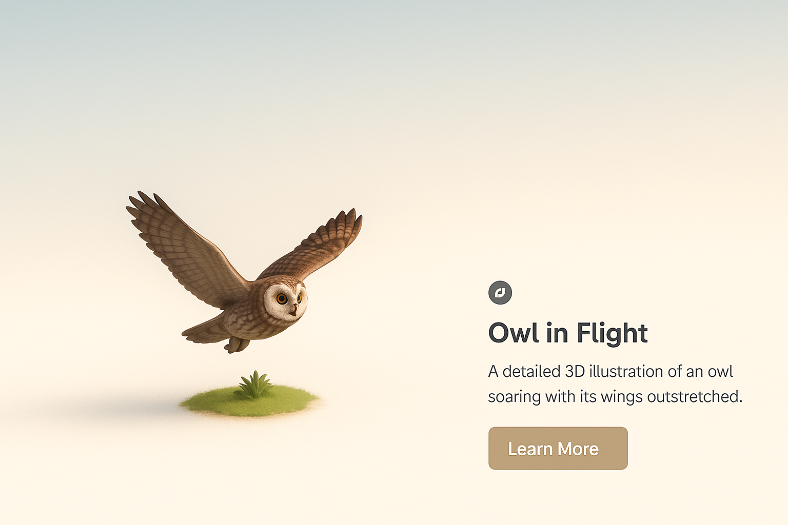 A detailed 3D representation of an owl soaring gracefully against a smooth gradient background, featuring its wings outstretched and a hint of its natural environment.
