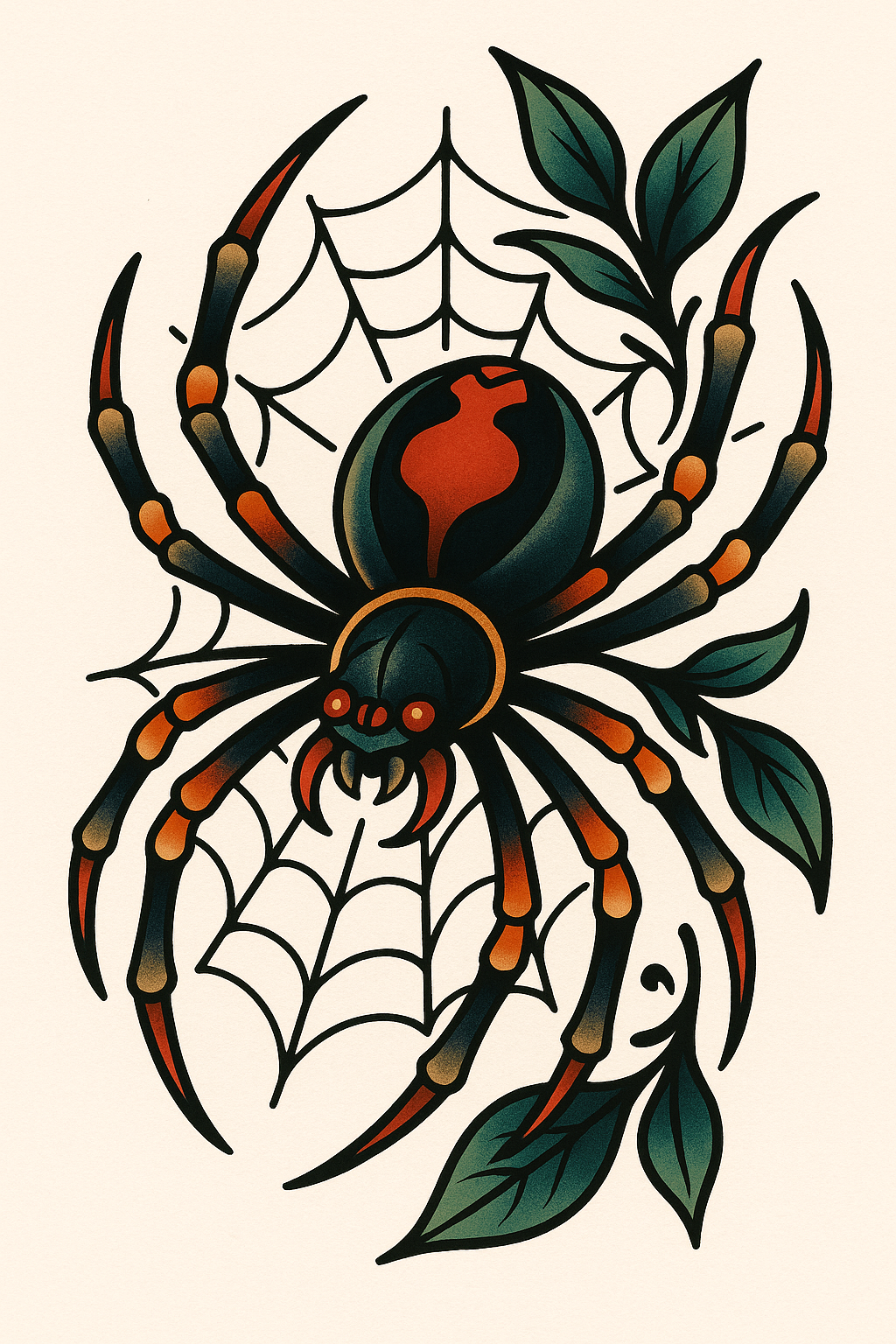 Vibrant spider artwork featuring intricate web and foliage elements. Ideal for tattoo design and illustrative purposes, showcasing a bold, graphic style.