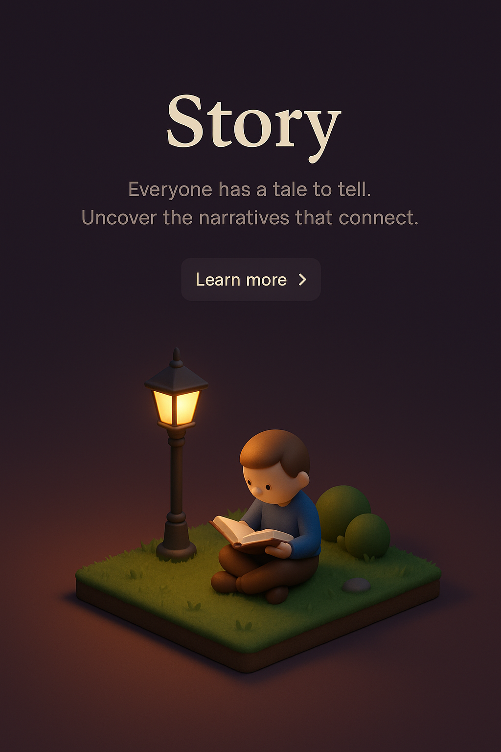 /Collection: /by davooda/Type: PNG/A captivating 3D scene depicting a character reading under a lamppost, set against a dark gradient background. The design focuses on storytelling with clear text and a call-to-action button.