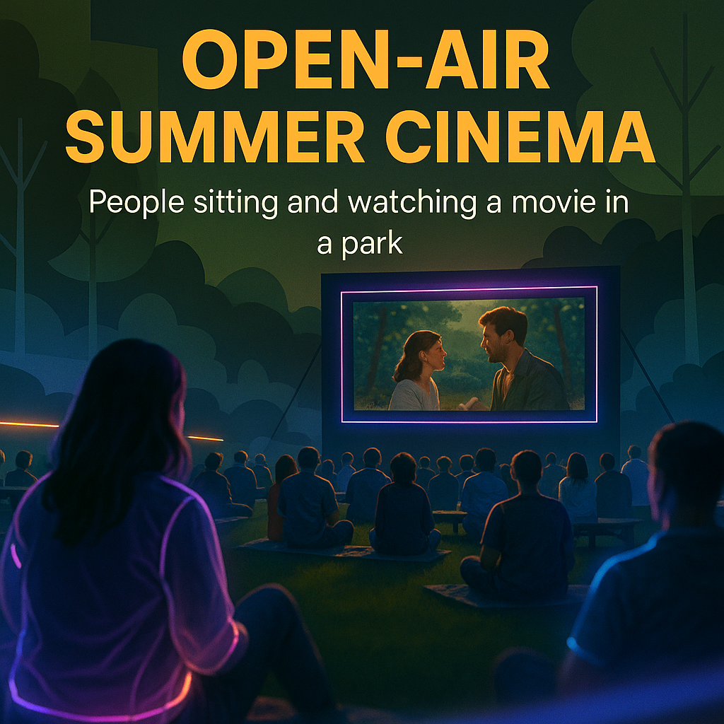 /Collection: /by davooda/Type: PNG/Vibrant illustration depicting a community gathering at an open-air summer cinema in a park. The scene captures people enjoying a movie under the stars, ideal for event promotions and outdoor activity marketing.