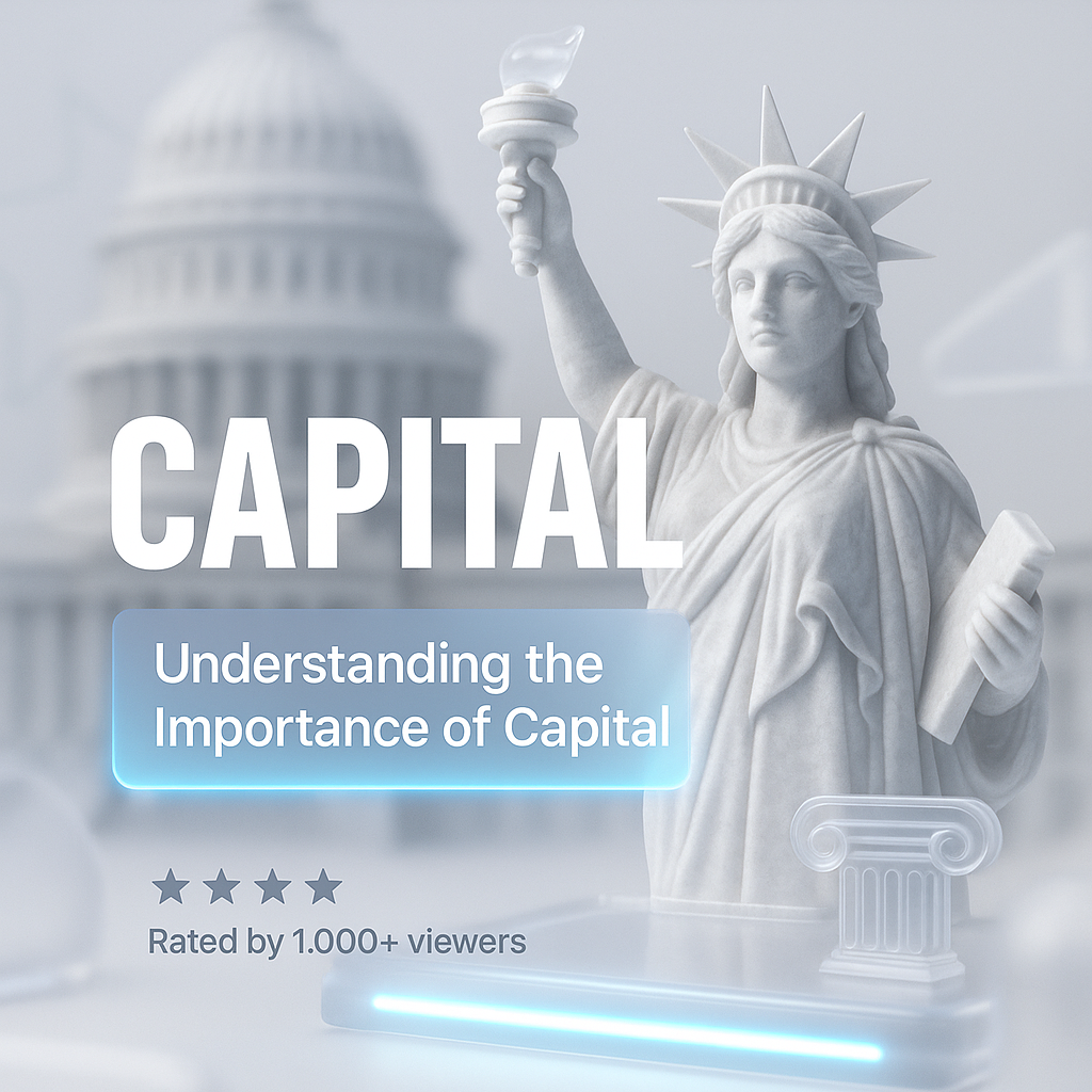 /Collection: /by davooda/Type: PNG/Modern 3D graphic highlighting the concept of capital with a stylized statue of liberty, ideal for educational content about finance and economics.