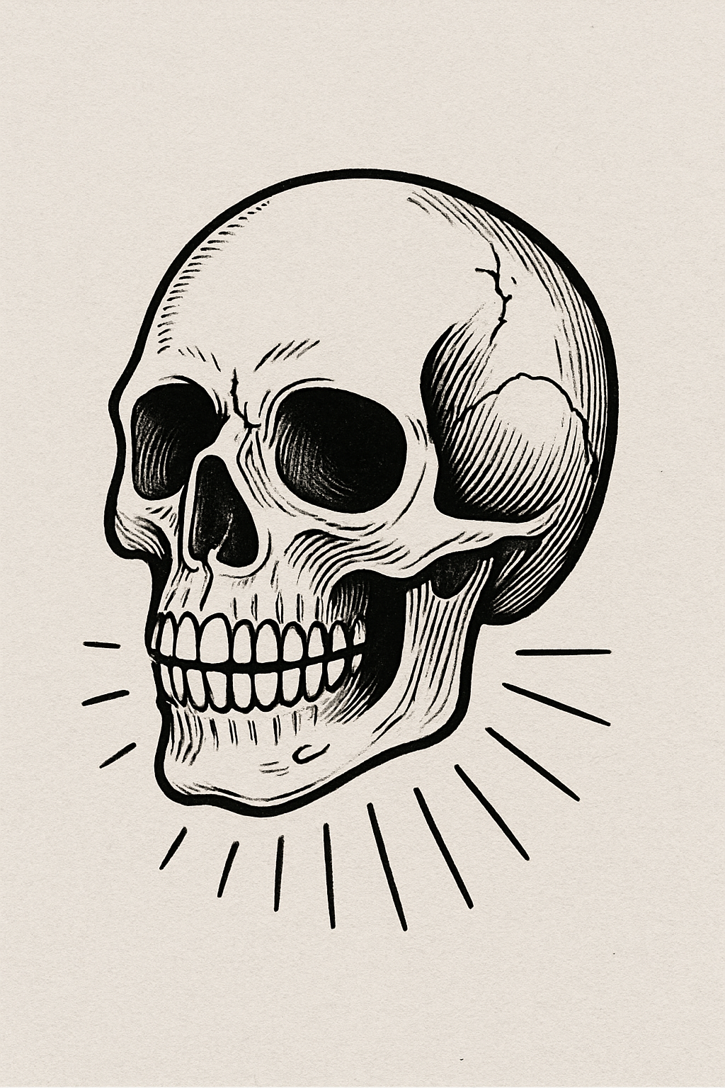 This is a graphic illustration of a skull, featuring a clean and detailed design. Ideal for use in art prints, tattoos, or Halloween-themed graphics.