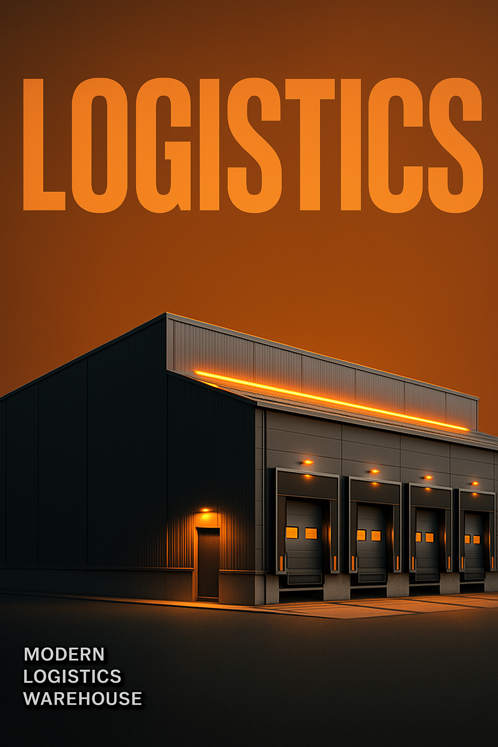 /Collection: /by davooda/Type: PNG/A striking image of a modern logistics warehouse with glowing accents and a powerful minimalistic style. The bold word 'LOGISTICS' dominates the upper half, complemented by smaller text elements.