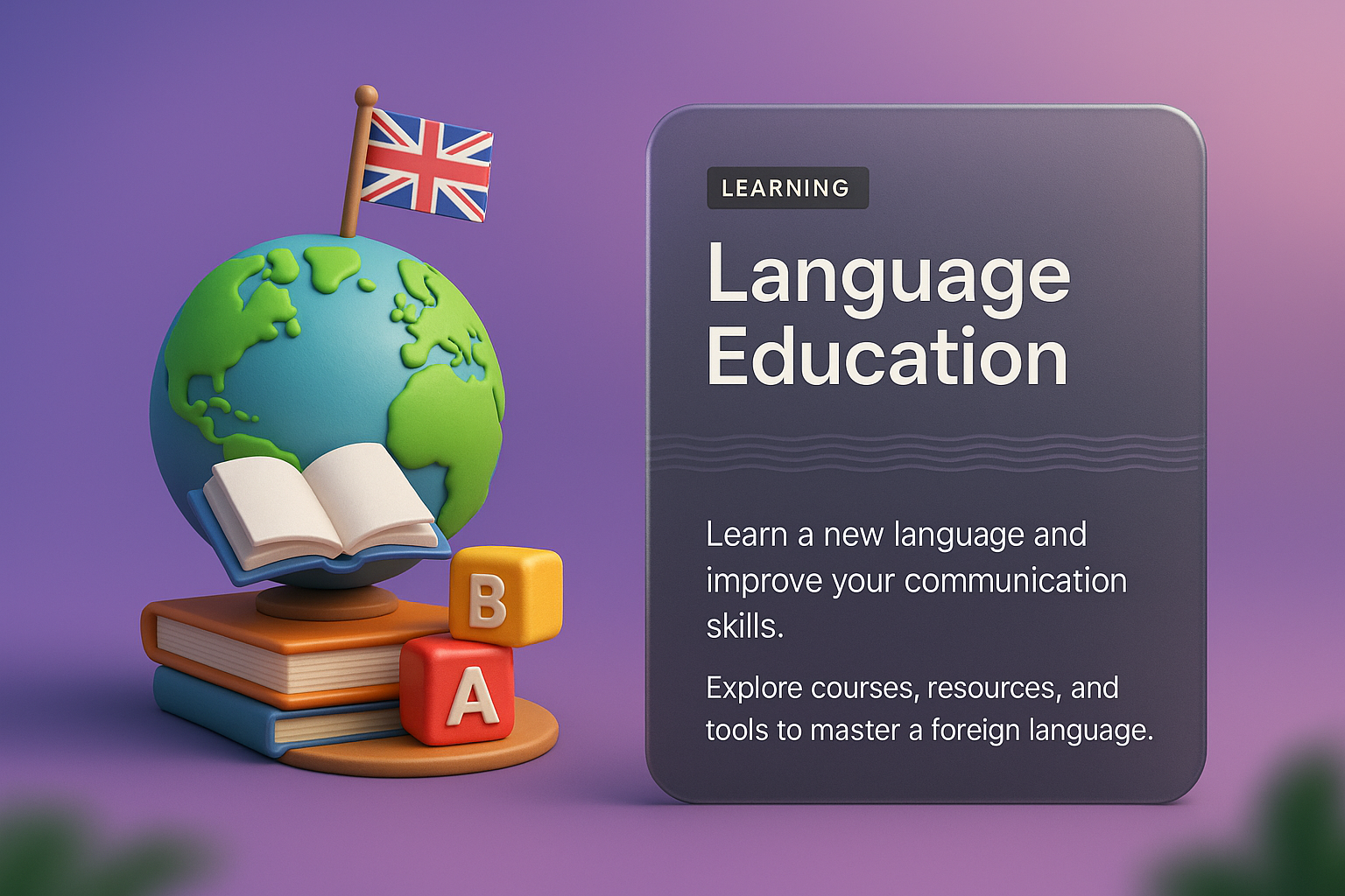 /Collection: /by davooda/Type: PNG/A vibrant 3D illustration featuring a globe, books, and blocks that promote language education. The design incorporates a British flag and a modern layout.