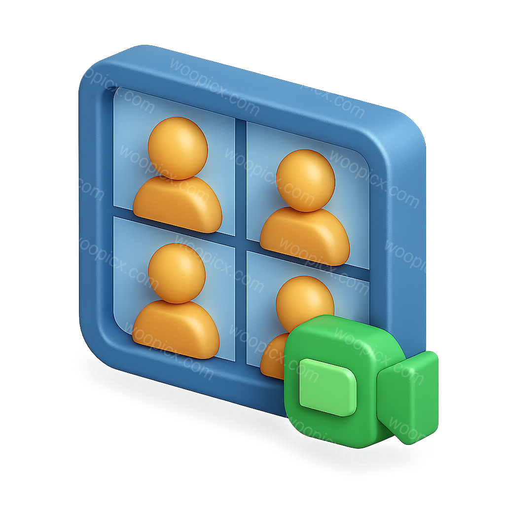 A visually appealing 3D icon depicting a video call interface. The design features a grid of four participant icons and a camera symbol, all rendered in vibrant colors with a three-quarter view.