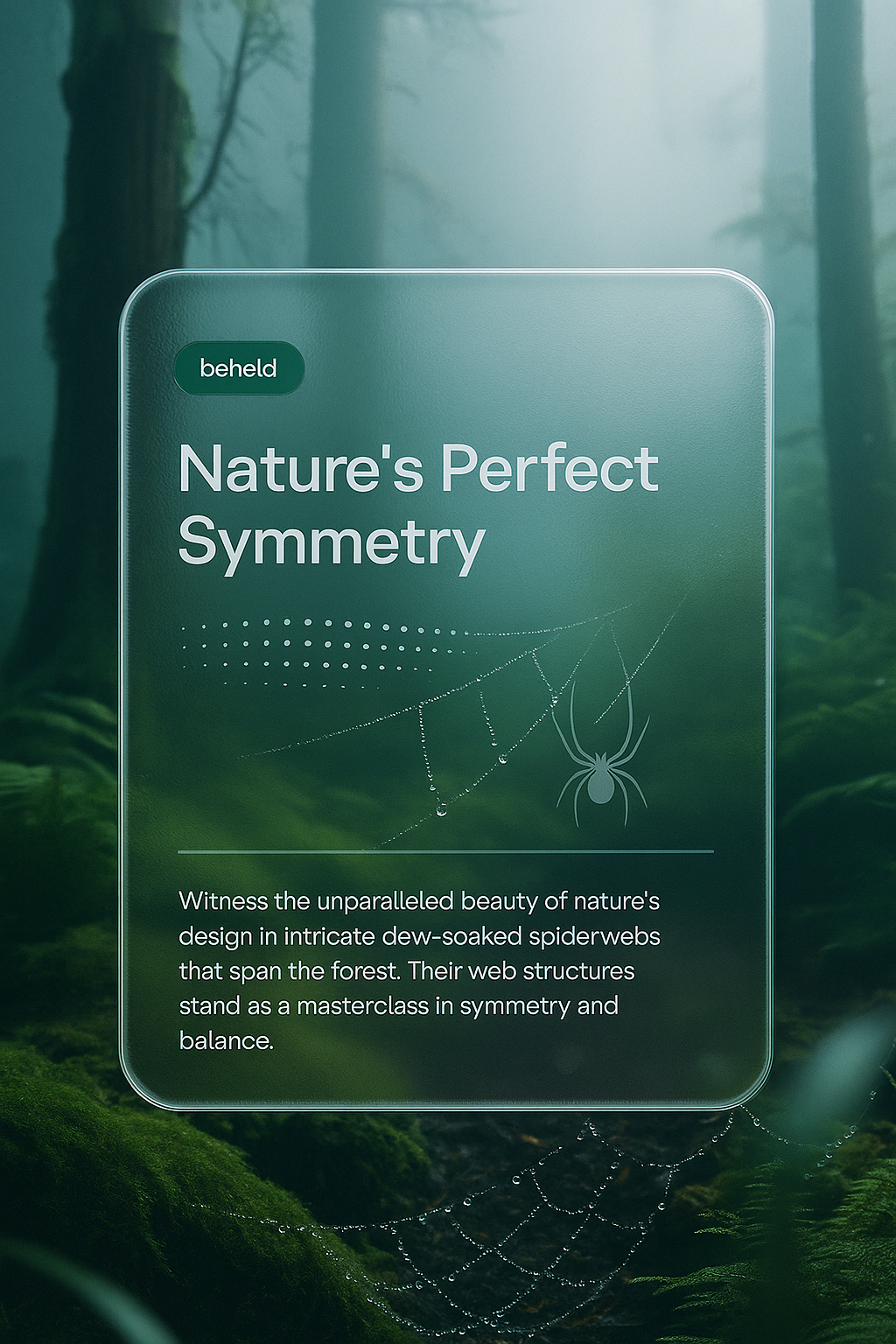 /Collection: /by davooda/Type: PNG/A serene forest scene illuminated by morning sunlight, featuring a light mist, lush moss, and ferns. Dewdrops adorn intricate spiderwebs, showcasing nature's symmetry.