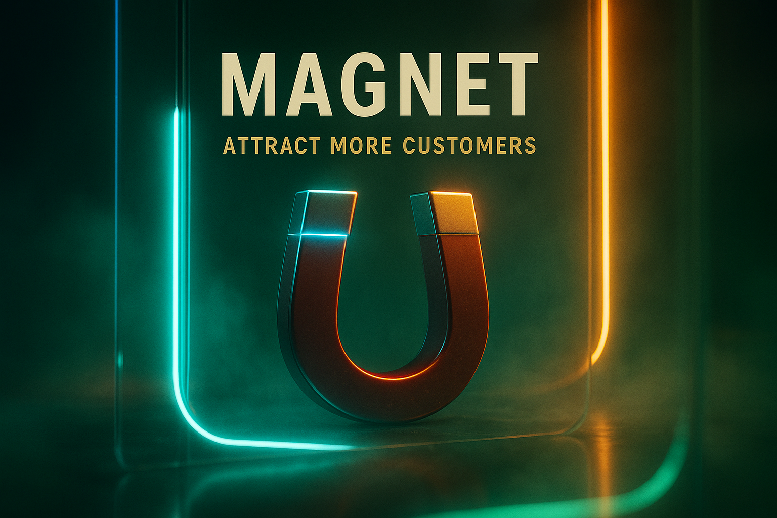 A striking neon-themed magnet illustration, featuring glowing edges and a translucent glass effect. Text highlights the message 'Attract More Customers' in a professional layout.
