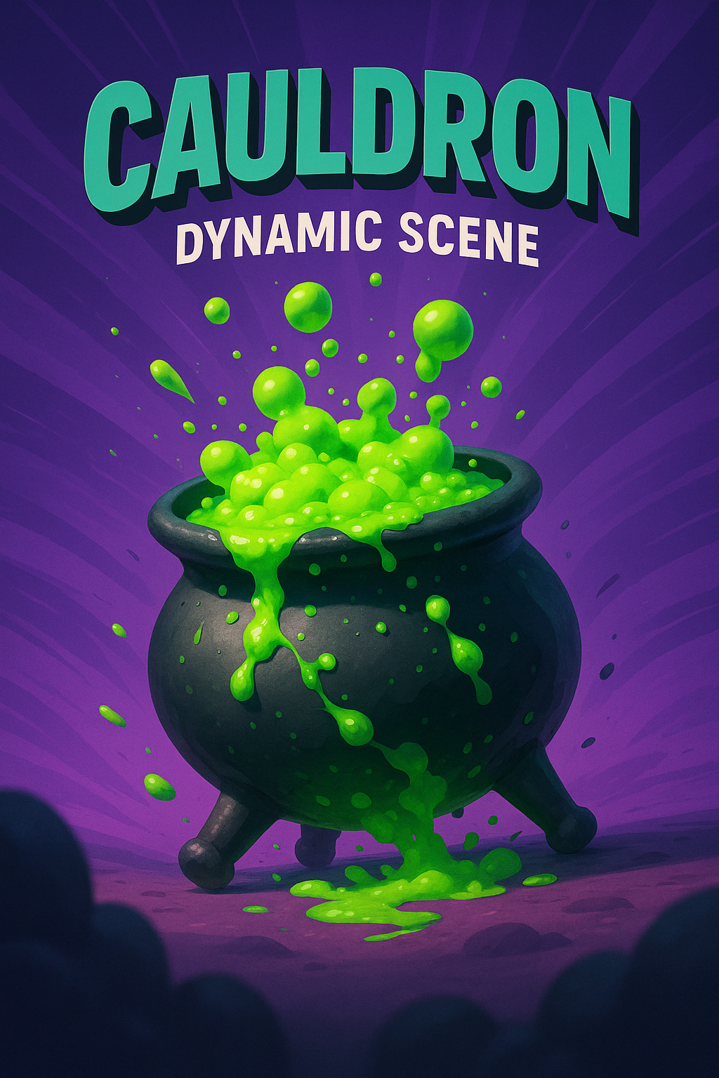 A lively cauldron bubbling with bright green liquid, set against a dynamic, gradient background. The scene captures energy and movement, with rays emanating from the center.