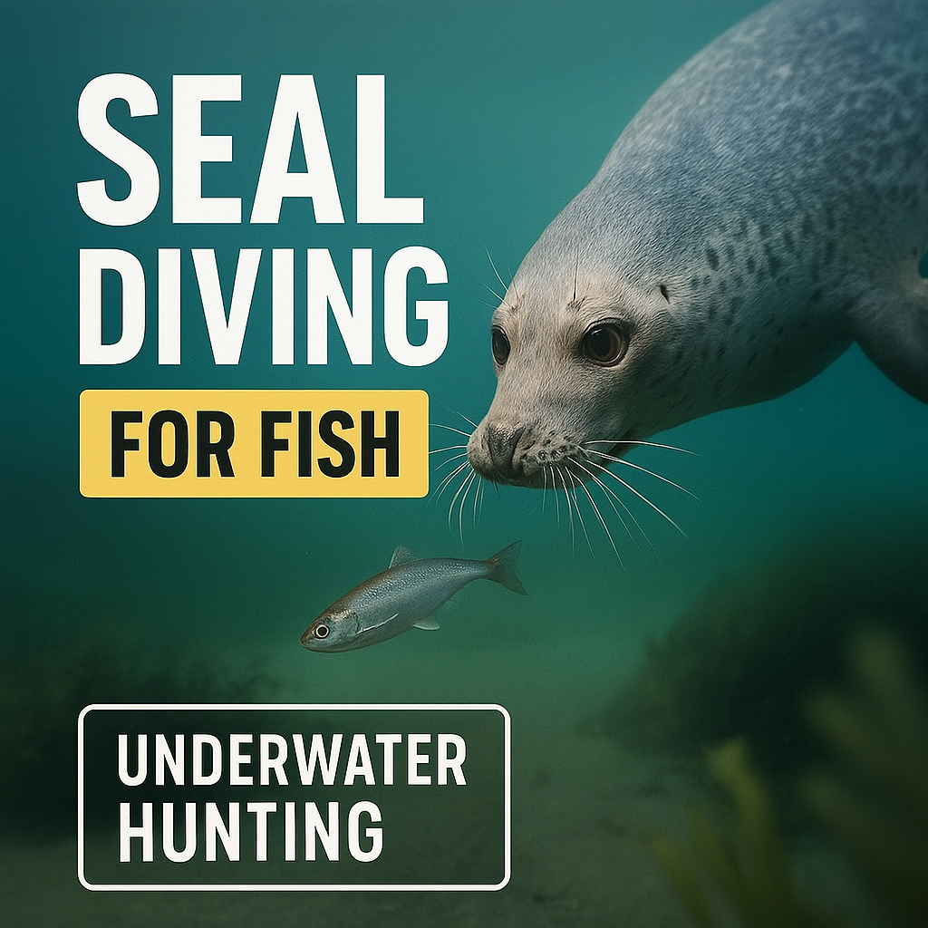 /Collection: /by davooda/Type: PNG/A visually striking thumbnail showcasing a seal diving underwater, emphasizing the theme of fishing. The design features bold text and an engaging background.