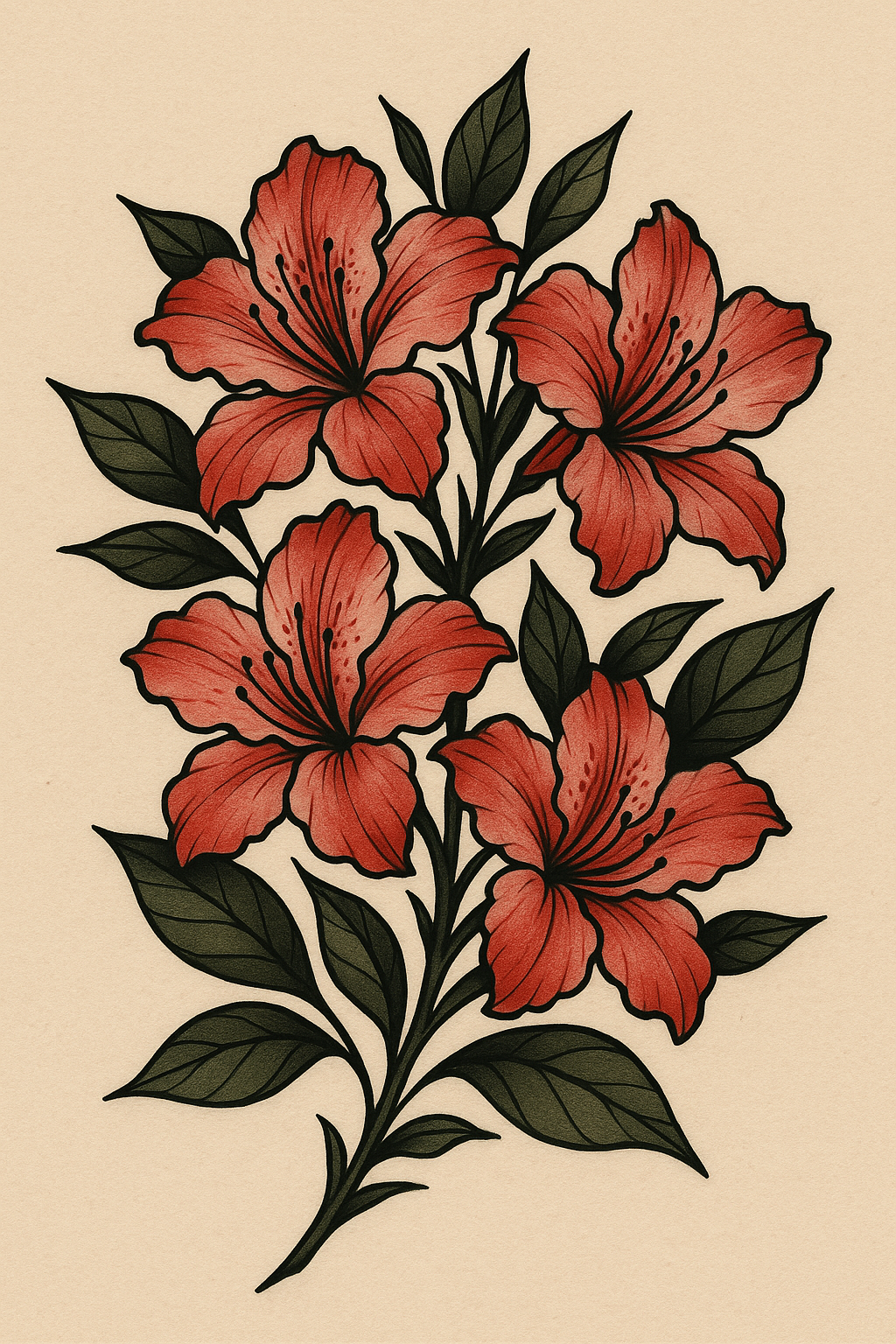 /Collection: /by davooda/Type: PNG/This is a detailed illustration of red flowers with green leaves on a soft beige background. It showcases a botanical theme, ideal for decor or design projects.