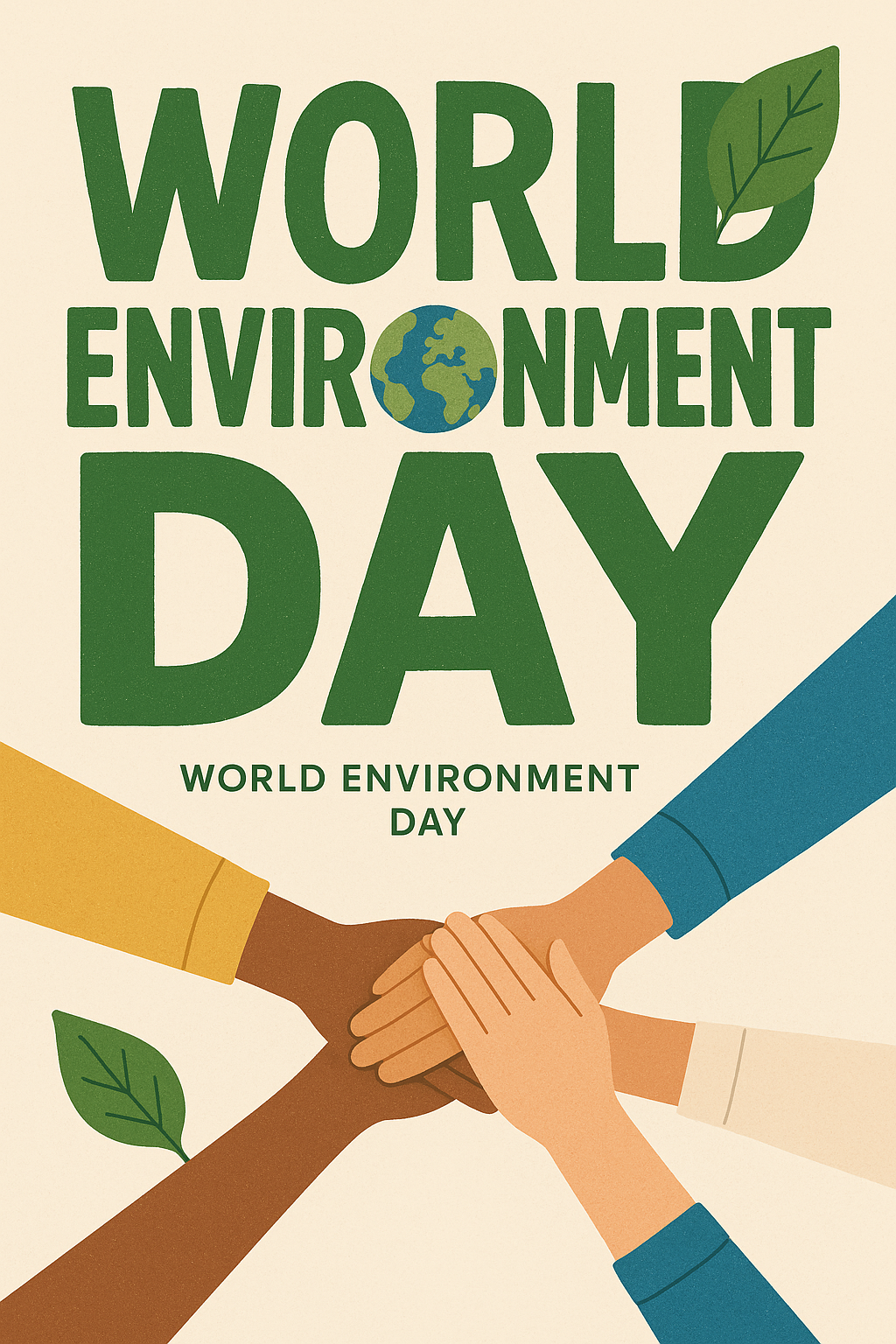 Illustrative poster promoting World Environment Day featuring diverse hands united around a globe, emphasizing environmental awareness and community engagement.