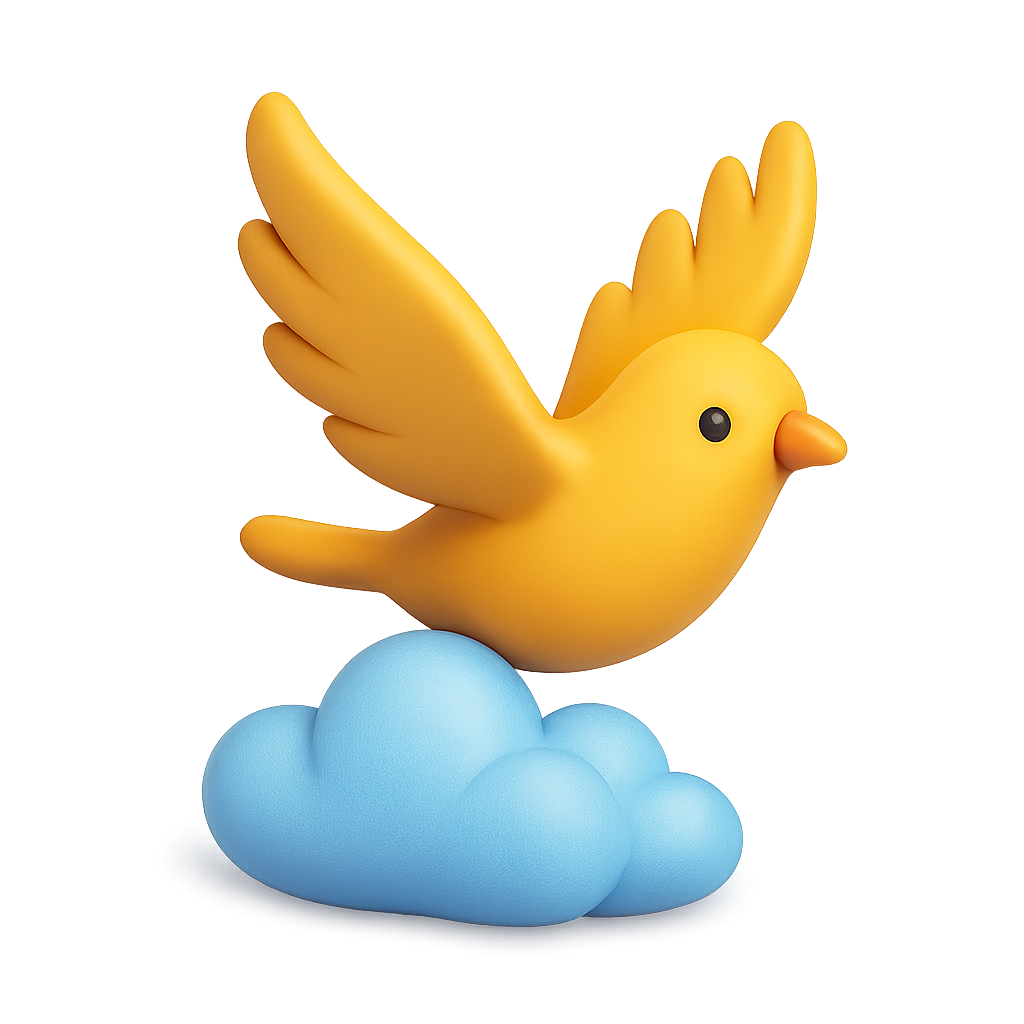 A colorful 3D isometric icon featuring a stylized yellow bird with wings spread, perched atop a soft blue cloud. The design has a playful, volumetric feel.