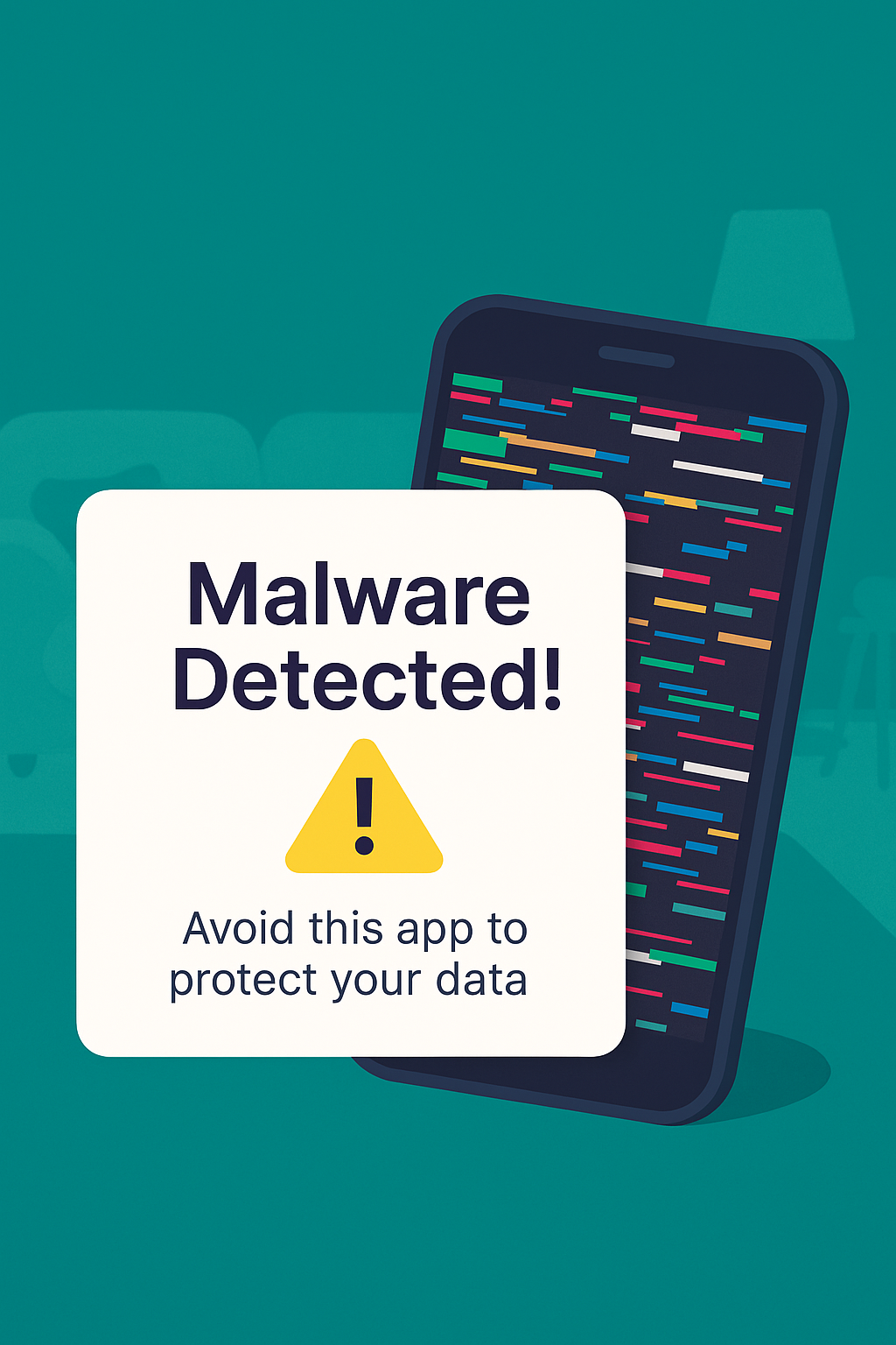 Illustrative graphic depicting a mobile device with a malware alert, designed to raise awareness about data security. The modern design appeals to tech-savvy audiences.