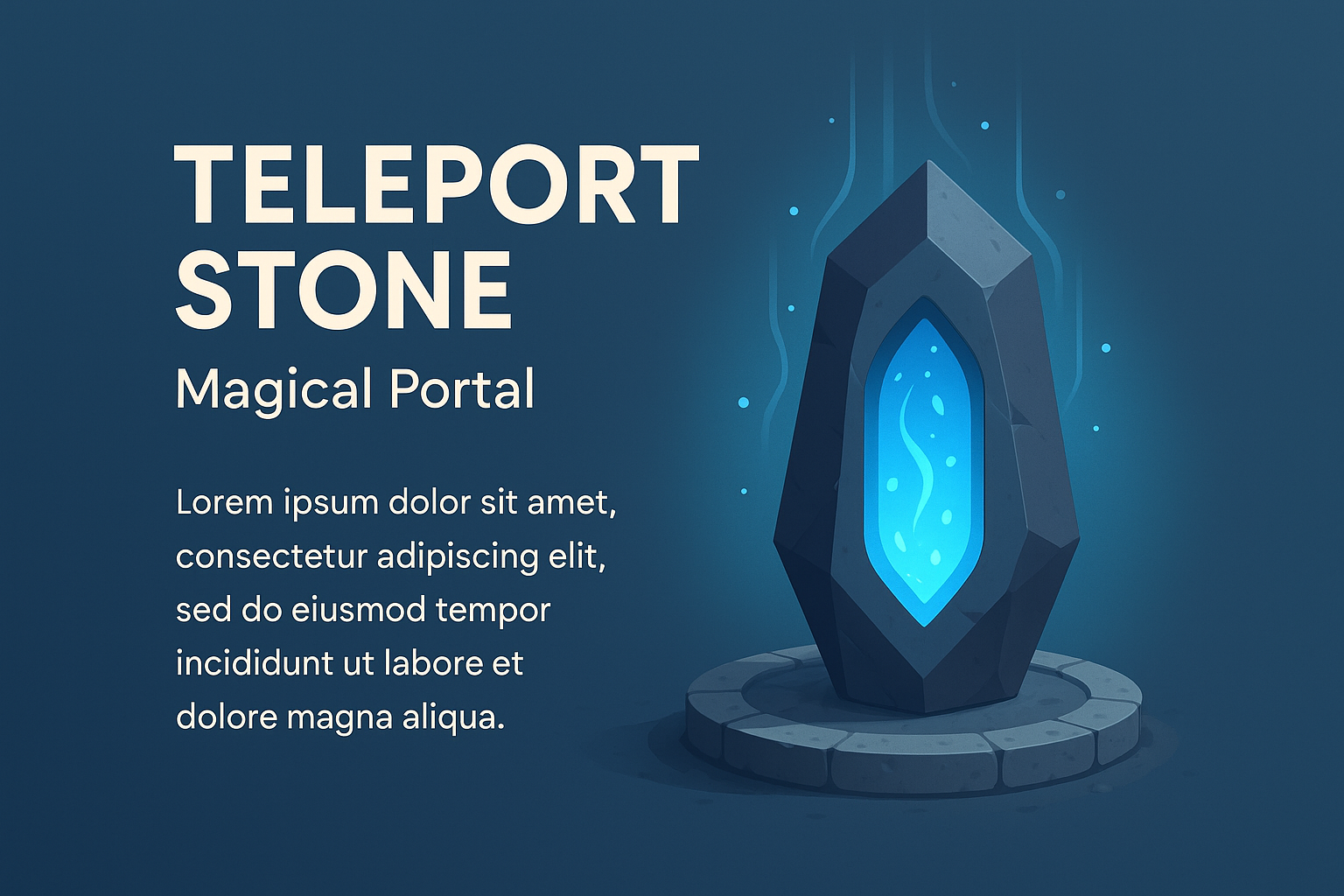 /Collection: /by davooda/Type: PNG/A visually striking teleport stone design features a geometric shape with a glowing blue core, set against a gradient background. The layout includes a title, subtitle, and descriptive text.