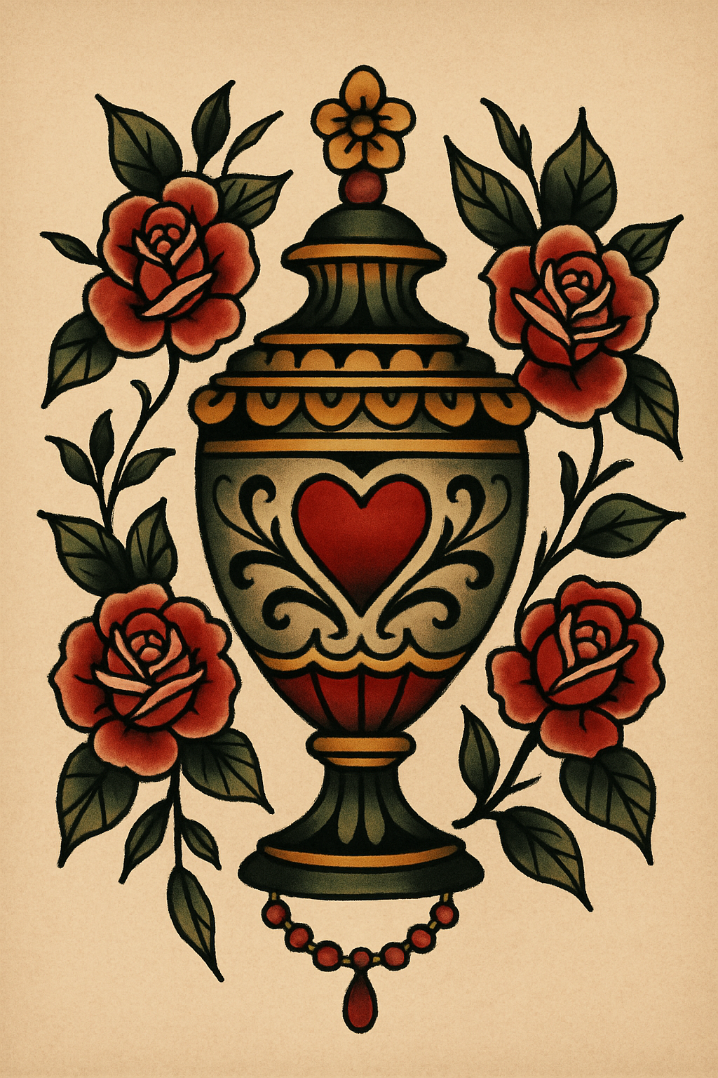 Traditional tattoo style urn with roses and heart motif