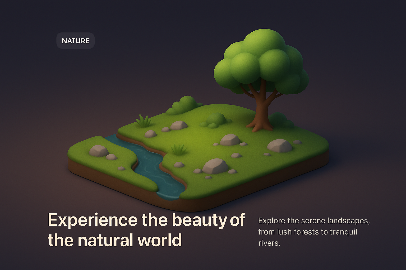 A zoomed-out 3D illustration showcasing a serene natural landscape featuring a tree, rocks, and a flowing river, set against a dark gradient background.