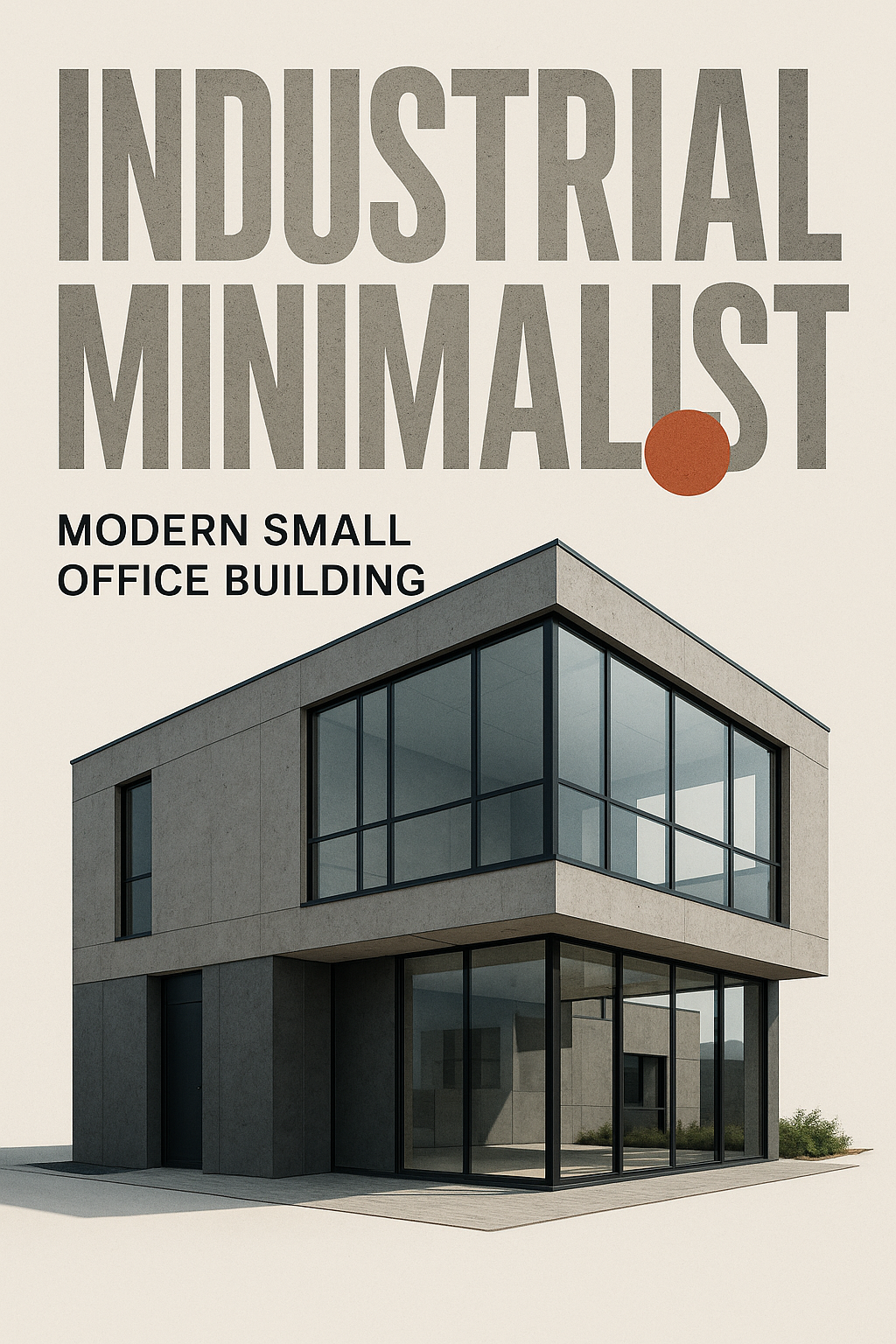 /Collection: /by davooda/Type: PNG/Architectural rendering showcasing a modern small office building with an industrial minimalist design. The clean lines and muted colors emphasize a contemporary aesthetic ideal for architecture and design presentations.