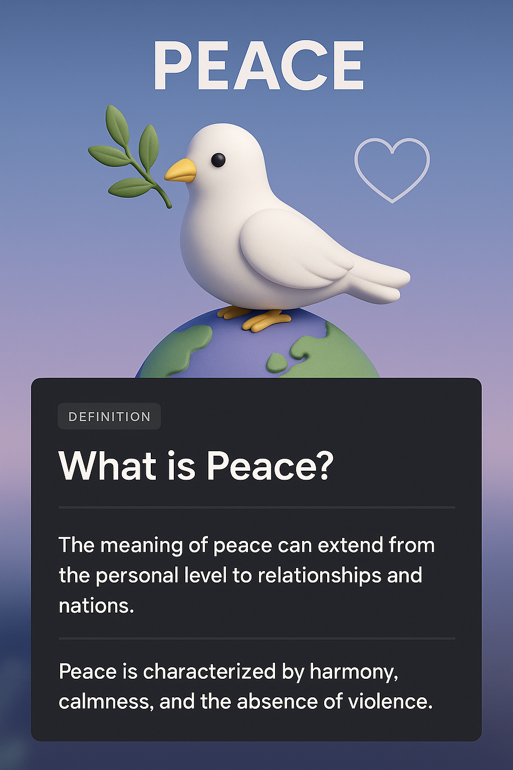 /Collection: /by davooda/Type: PNG/A serene 3D illustration featuring a dove on a globe, symbolizing peace. The design includes a dark label with a definition of peace, complemented by soft gradient colors.