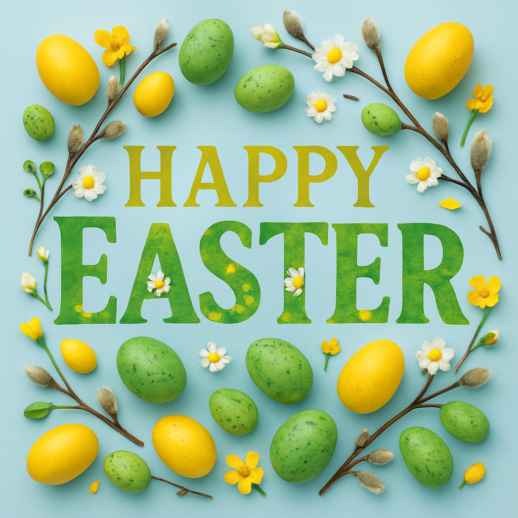 Vibrant Easter-themed graphic featuring colorful eggs and floral elements, ideal for holiday greetings and seasonal promotions.