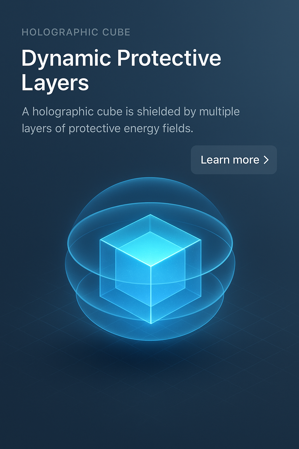 /Collection: /by davooda/Type: PNG/A visually striking 3D illustration of a holographic cube surrounded by dynamic protective layers. The design features a gradient background and clear text elements.