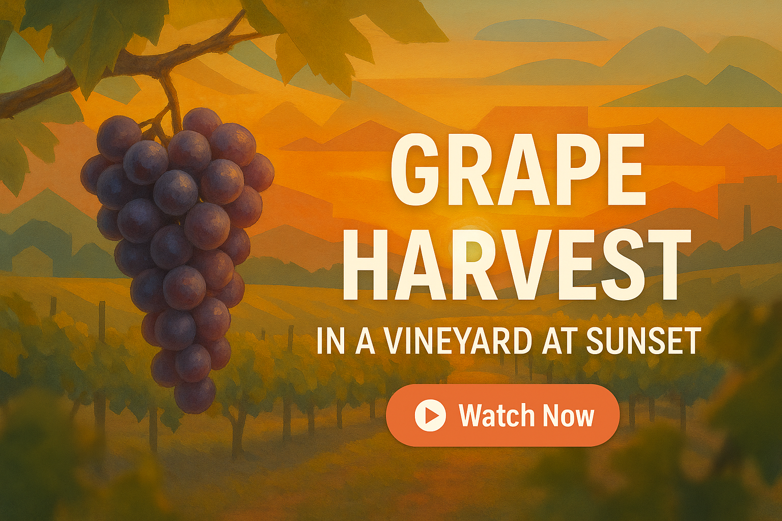 Artistic Illustration of Grape Harvest in Vineyard at Sunset