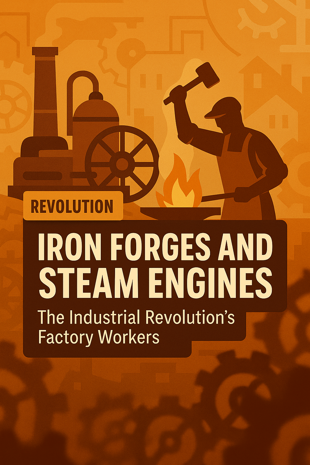 /Collection: /by davooda/Type: PNG/Vector-style graphic depicting the themes of the Industrial Revolution, focusing on iron forges and steam engines, suitable for educational materials or history presentations.